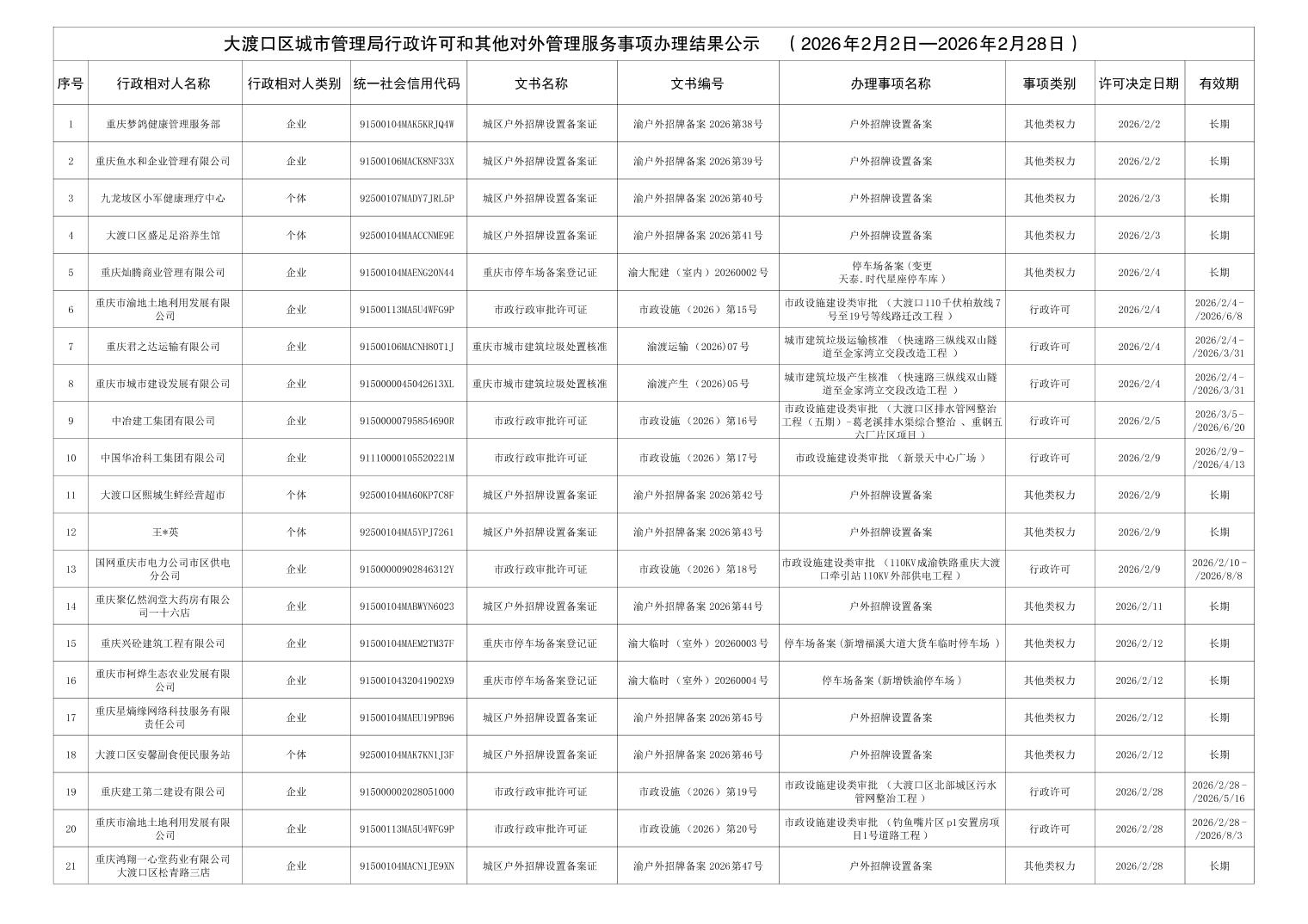 大渡口区城市管理局行政许可和其他对外管理服务事项办理结果公示(2026年2月2日—2026年2月28日)