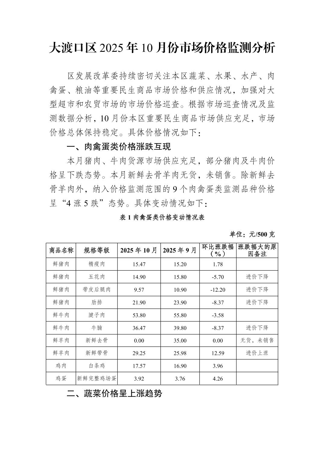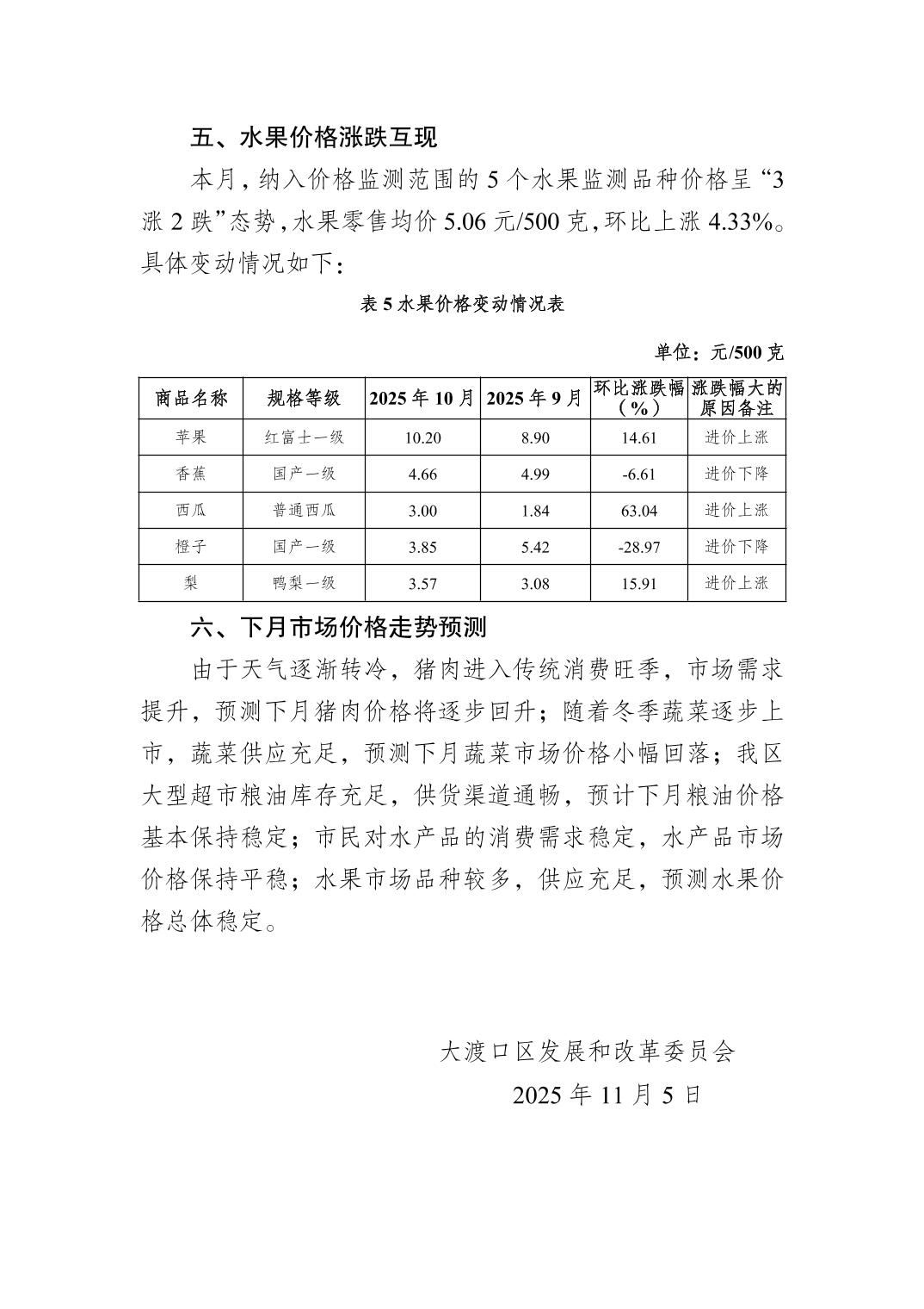 大渡口区2025年10月份市场价格监测分析