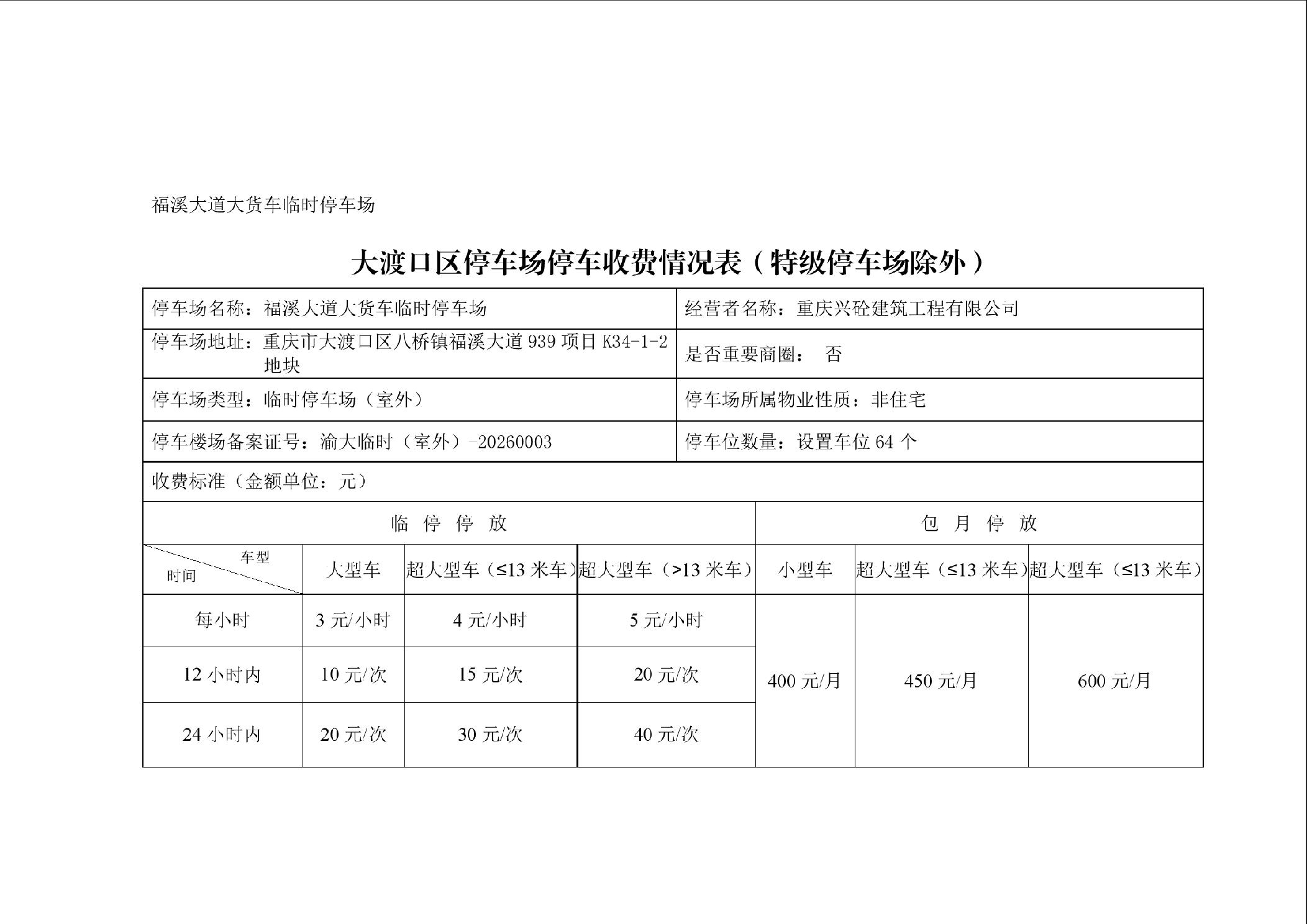 大渡口区停车场停车收费情况表(特级停车场除外)福溪大道大货车临时停车场