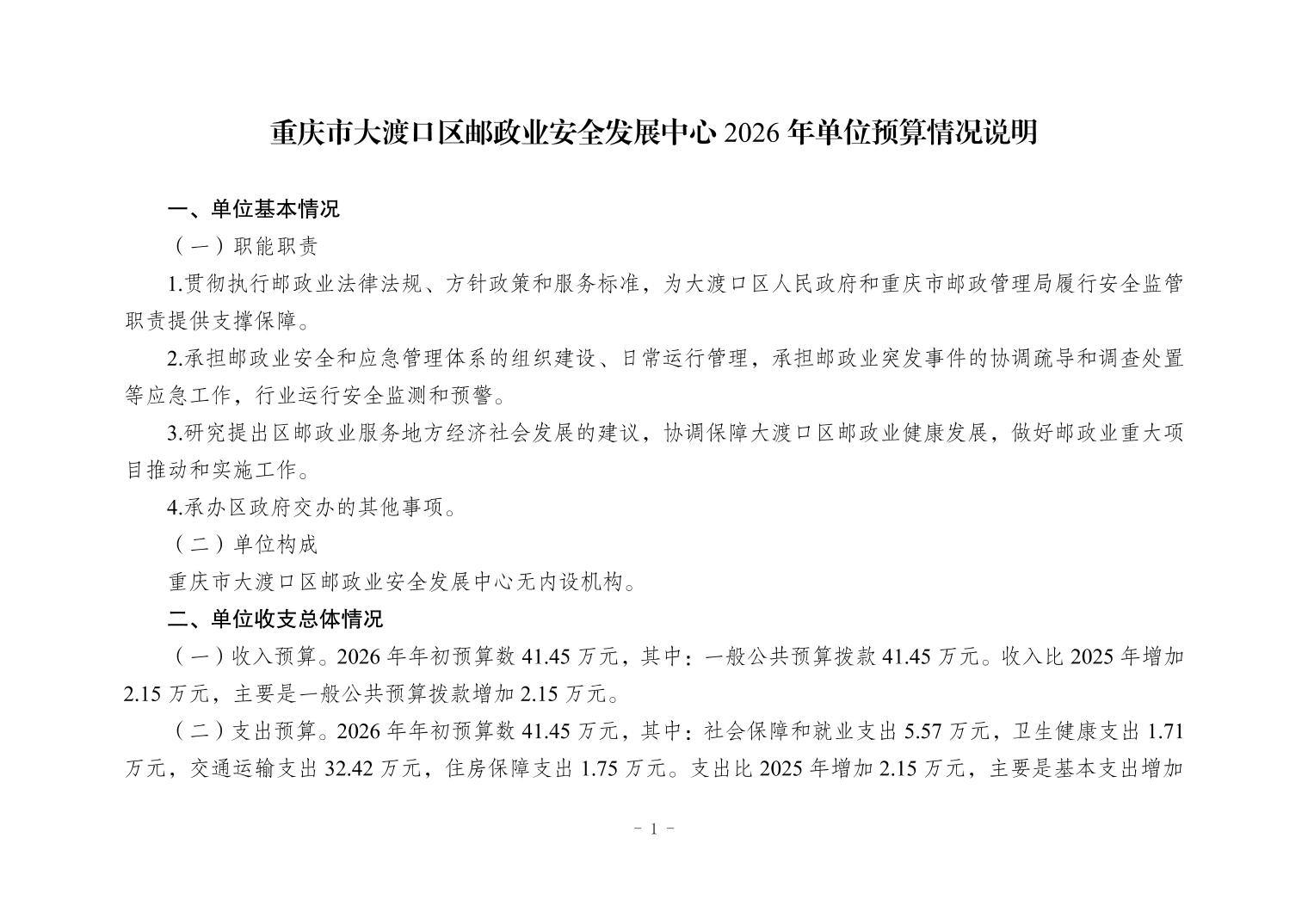 重庆市大渡口区邮政业安全发展中心2026年单位预算情况说明