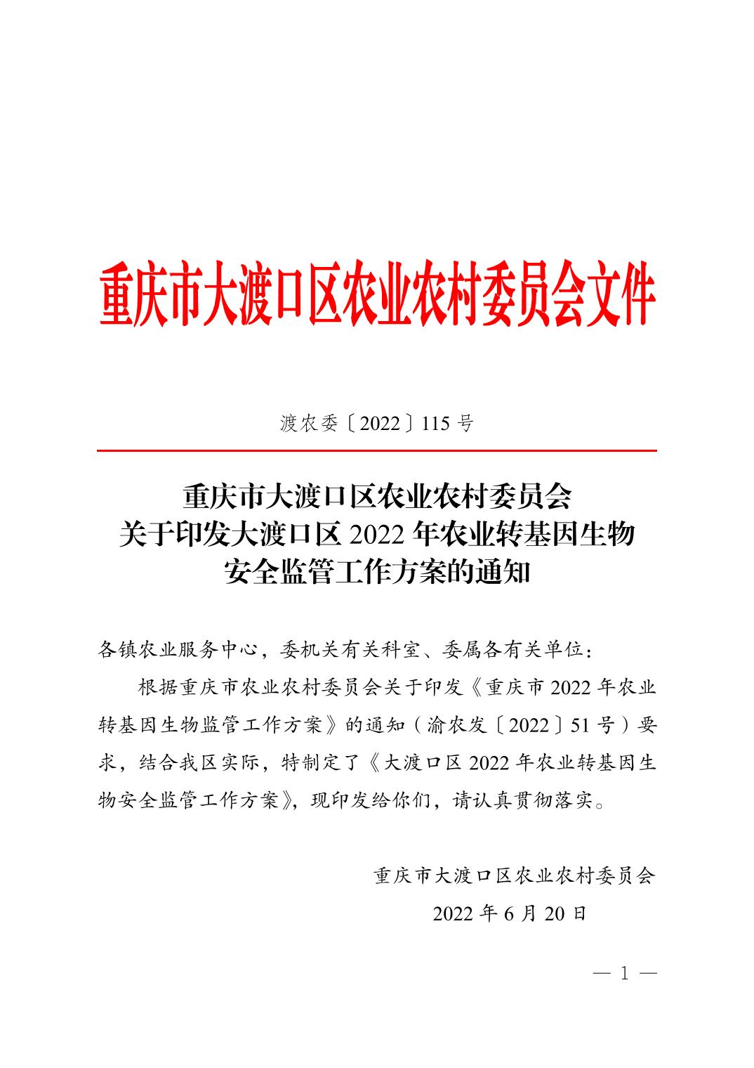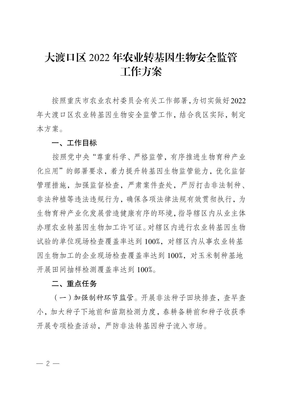重庆市大渡口区农业农村委员会关于印发大渡口区2022年农业转基因生物安全监管工作方案的通知