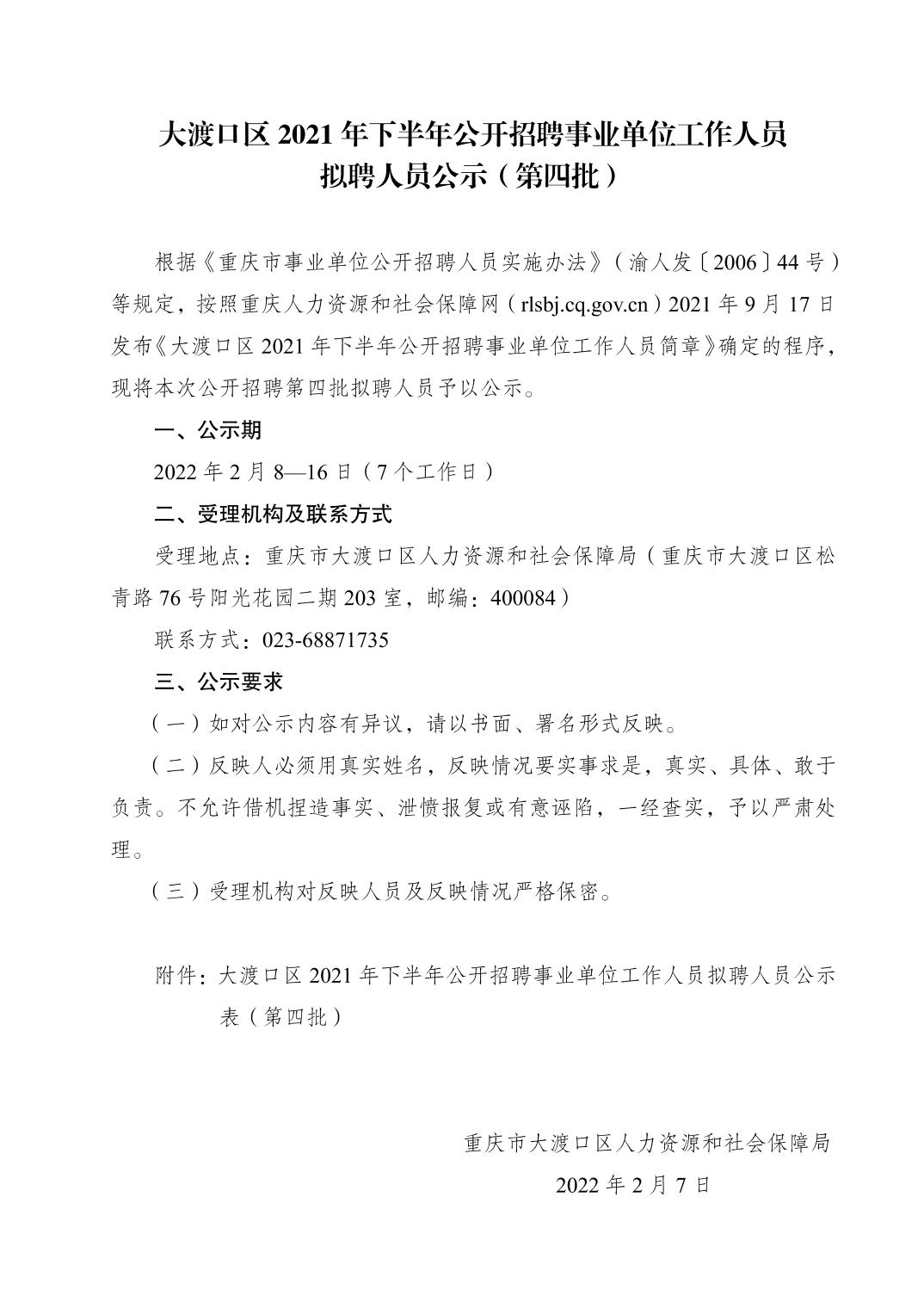 大渡口区2021年下半年公开招聘事业单位工作人员 拟聘人员公示(第四批)