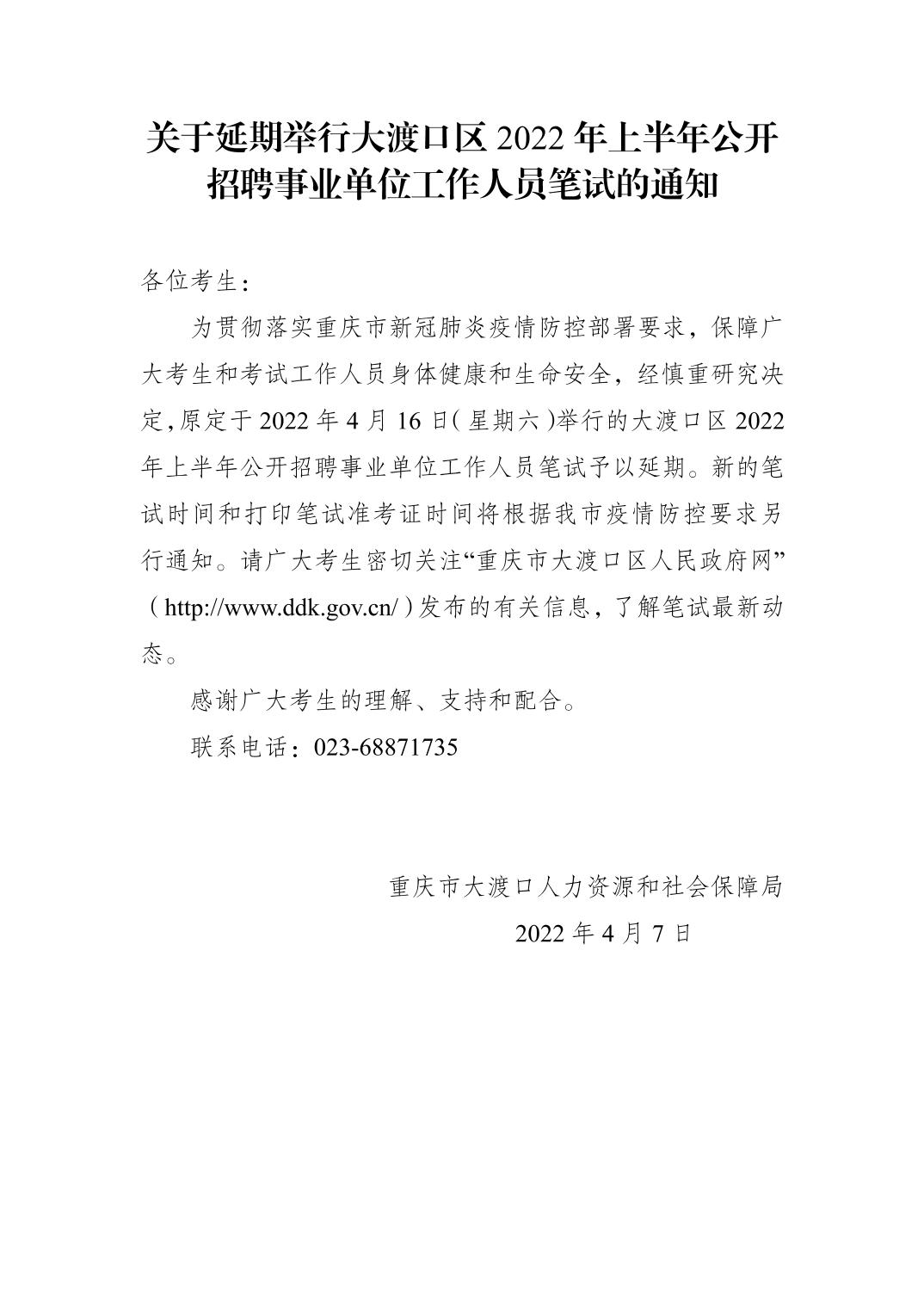 关于延期举行大渡口区2022年上半年公开招聘事业单位工作人员笔试的通知