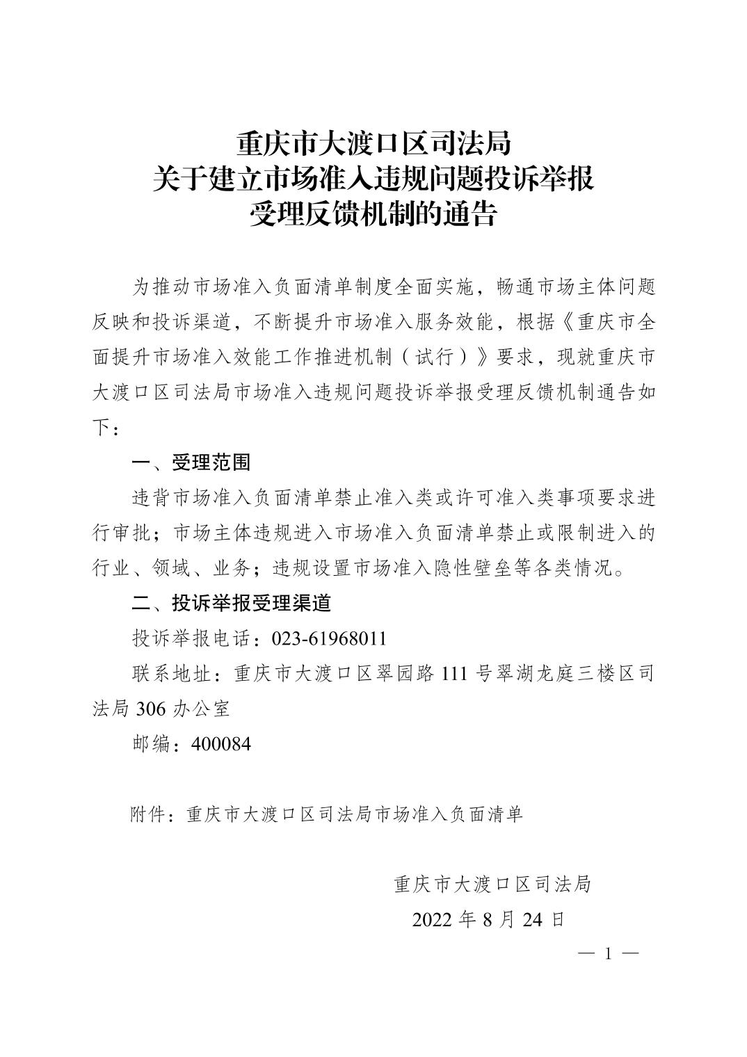 重庆市大渡口区司法局关于建立市场准入违规问题投诉举报受理反馈机制的通告