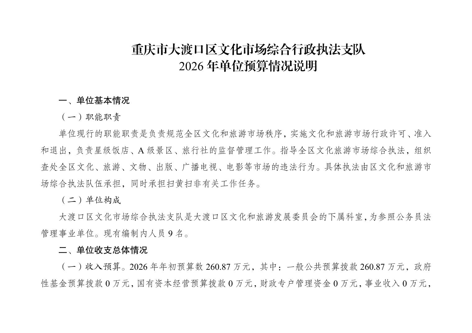 重庆市大渡口区文化市场综合行政执法支队2026年单位预算情况说明