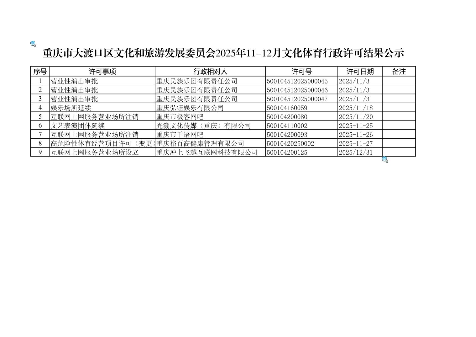 重庆市大渡口区文化和旅游发展委员会2025年11-12月文化体育行政许可结果公示