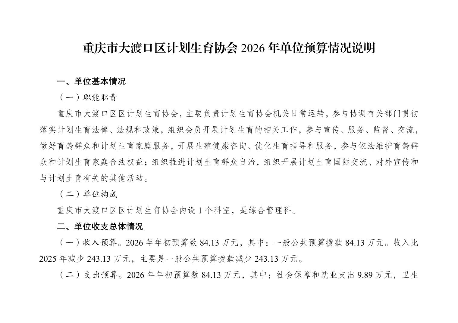 重庆市大渡口区计划生育协会2026年单位预算情况说明