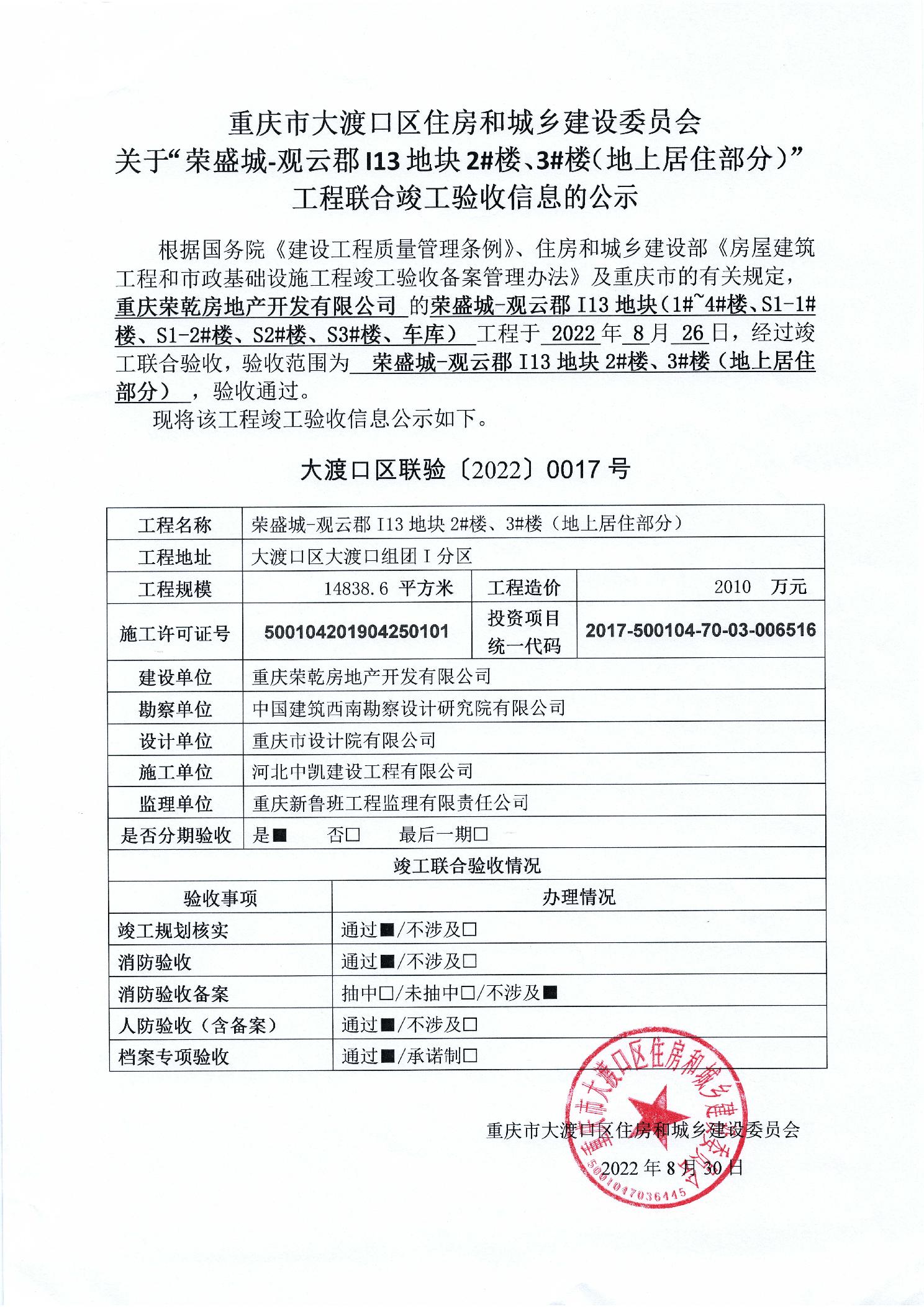 重庆市大渡口区住房和城乡建设委员会关于“荣盛城-观云郡I13地块2#楼、3#楼(地上居住部分)”工程联合竣工验收信息的公示