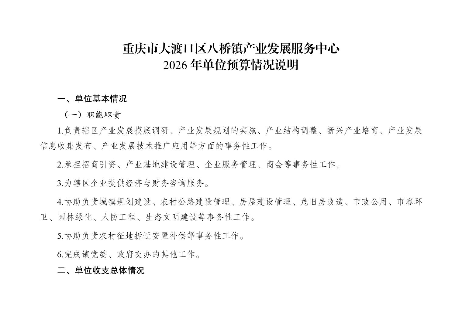 重庆市大渡口区八桥镇产业发展服务中心2026年单位预算情况说明