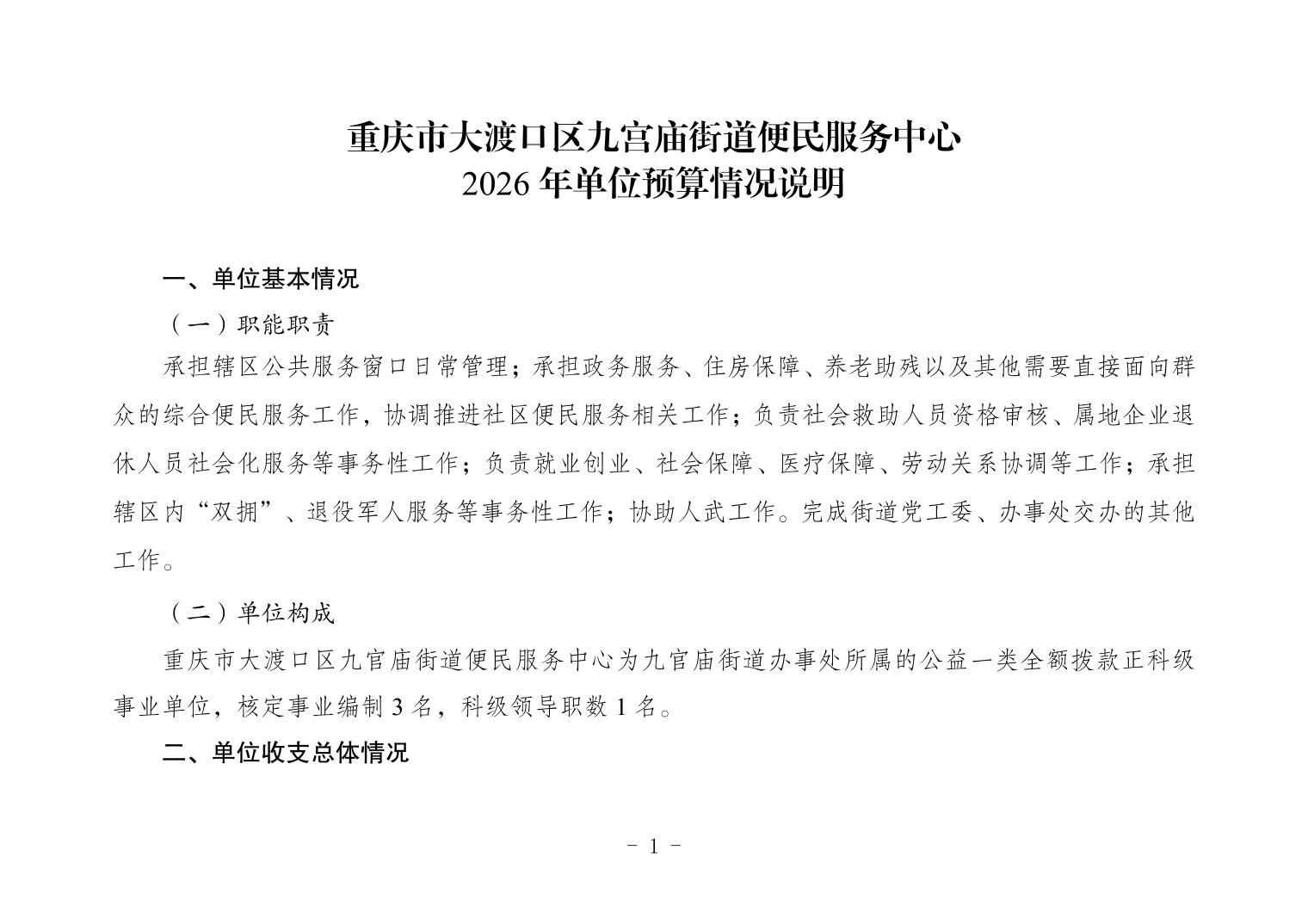 重庆市大渡口区九宫庙街道便民服务中心2026年单位预算情况说明