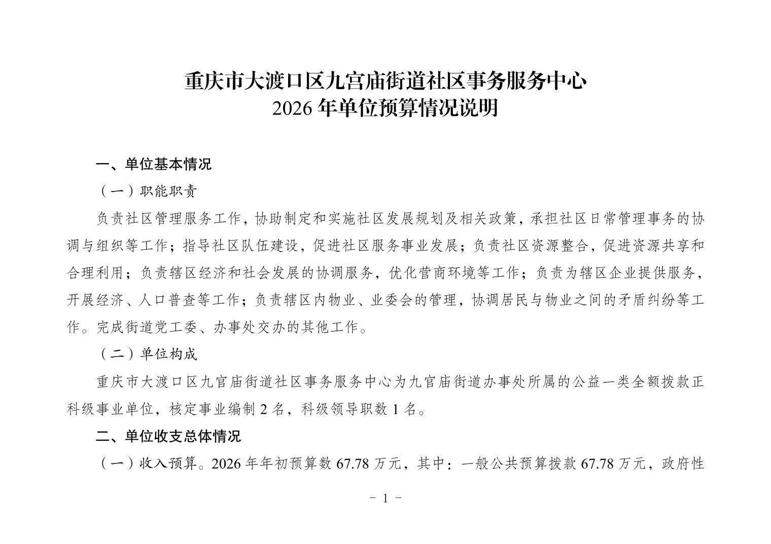重庆市大渡口区九宫庙街道社区事务服务中心2026年单位预算情况说明