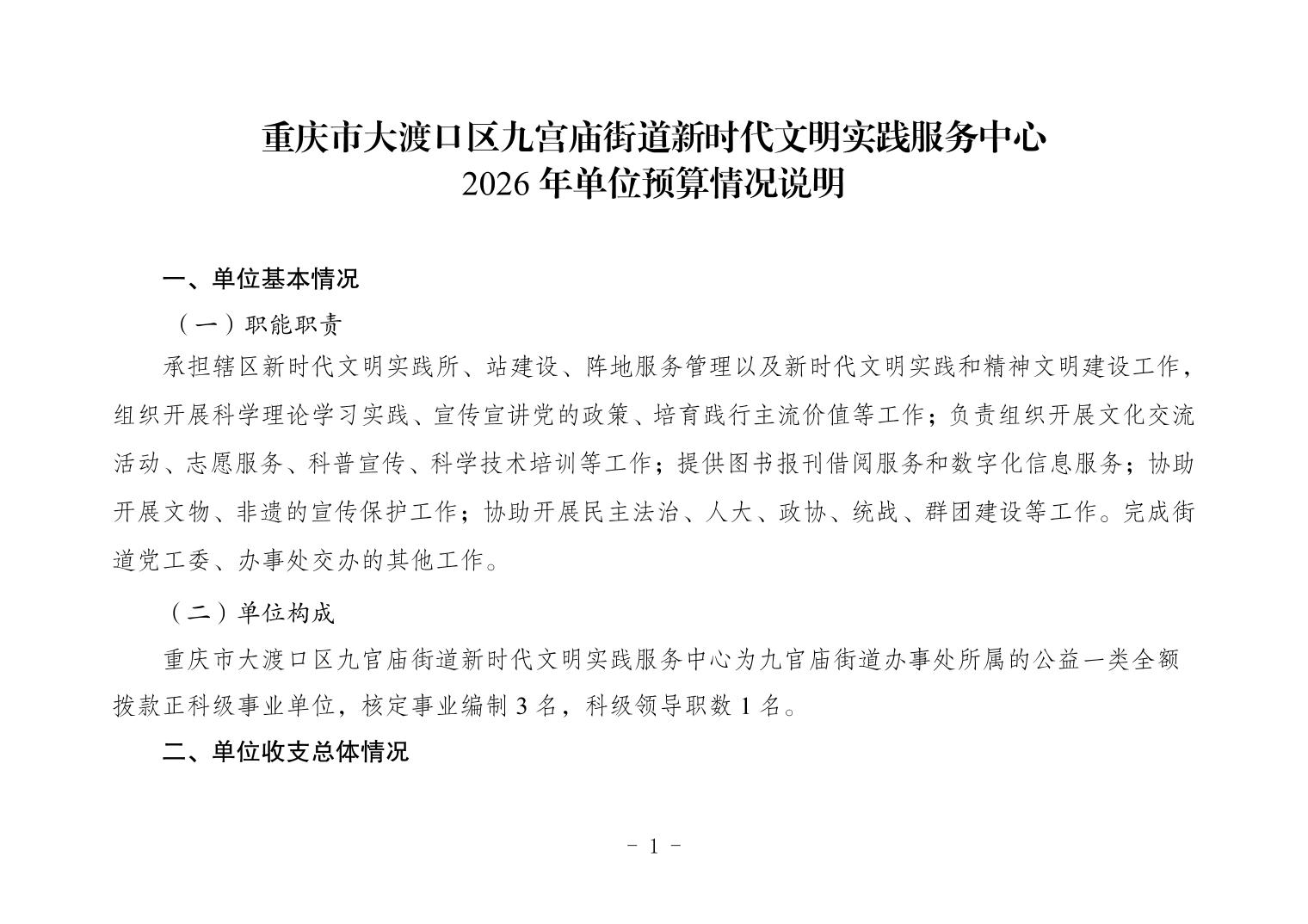 重庆市大渡口区九宫庙街道新时代文明实践服务中心2026年单位预算情况说明