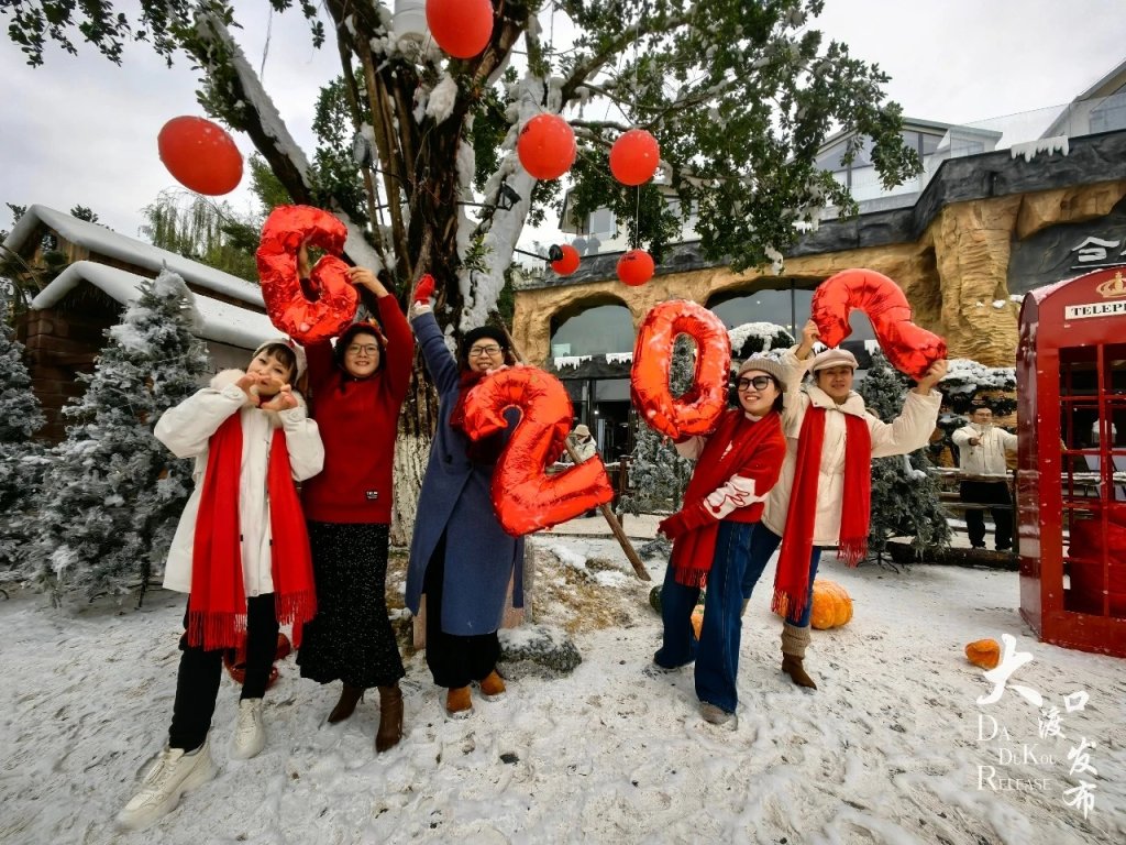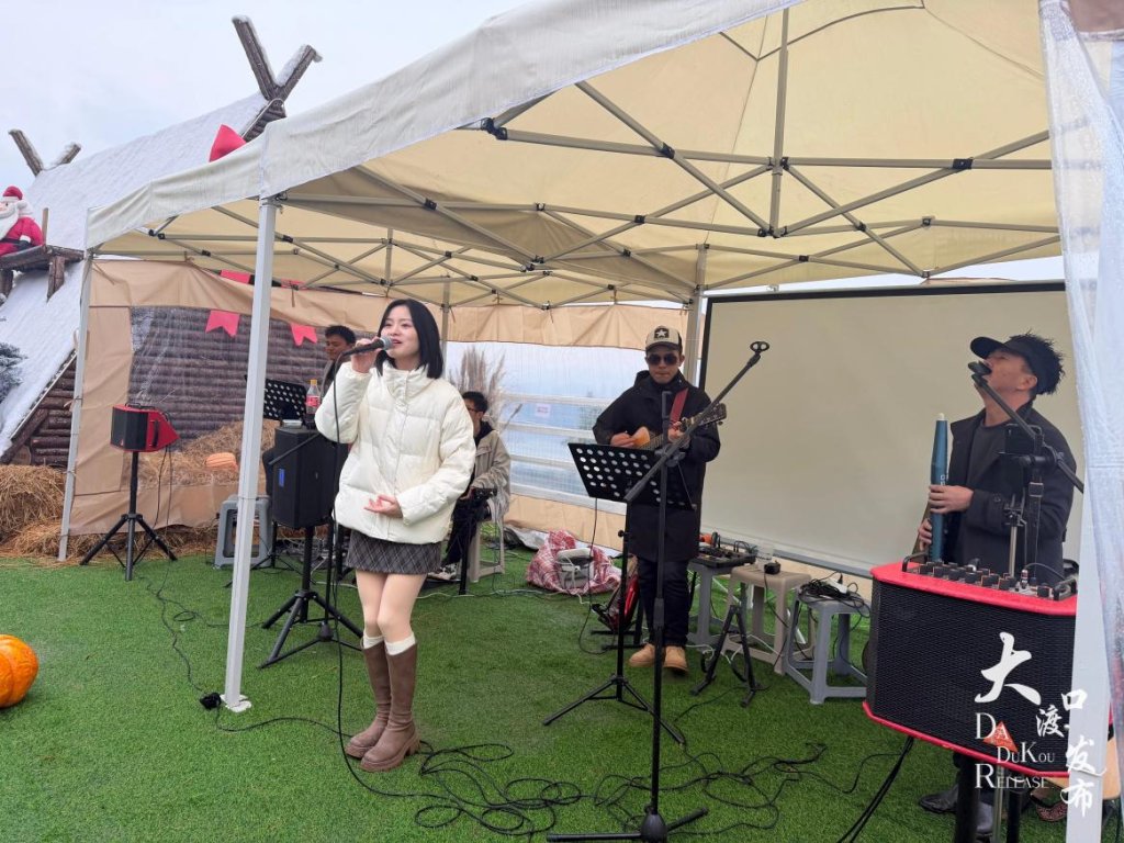 下午3点,草坪上乐队歌声响起,欢快的旋律裹挟着“雪”粒漫开,游客们闻声围拢,跟着鼓点轻轻晃着身子,不自觉地齐声合唱。“游客们大多上午就带着孩子过来玩,一直待到晚上吃完火锅才返程。”长江石居负责人介绍,假期前两天,不仅白天游玩的客人络绎不绝,晚餐的火锅更是爆满,目前,1月3日晚上的用餐预订都已接到40桌!
