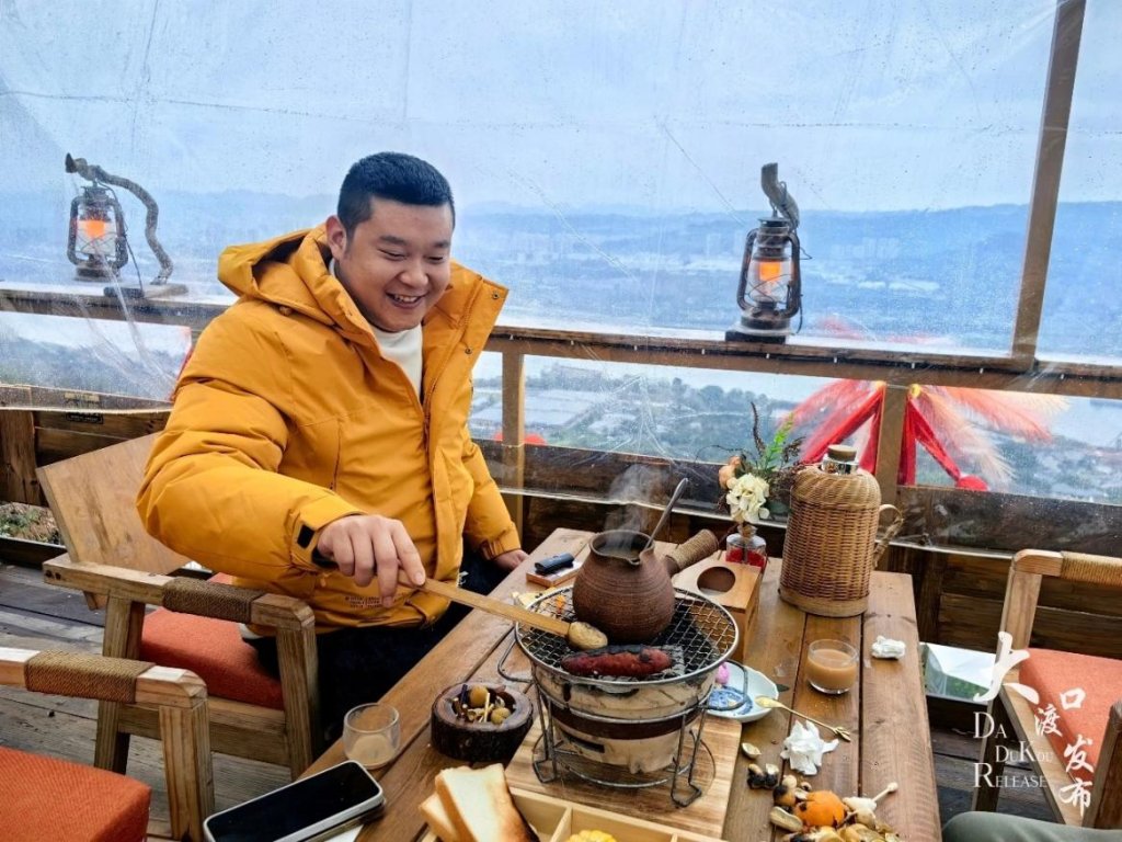 不远处的半山茶咖店内暖意融融,暖炉里炭火噼啪作响,烤红薯与桂圆的香甜气息漫溢全屋,人们捧一杯热茶,凭窗而坐,将金鳌山的烟雨朦胧与山水景致尽收眼底。“我是第一次来,专门从合川区过来耍,这里村美店靓,雨天躲进这半山小院喝茶赏景,太惬意了。”游客苏女士抿着热茶,眉眼间满是舒心。