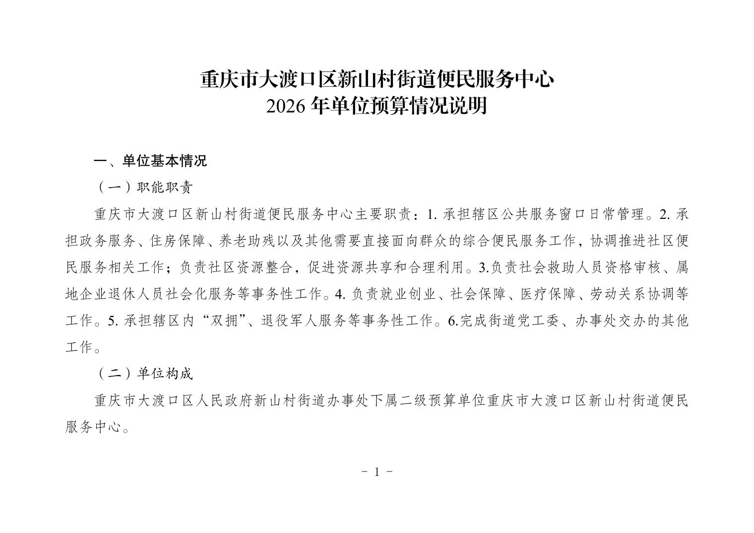 154005重庆市大渡口区新山村街道便民服务中心2026年单位预算情况说明