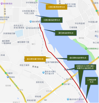 大滨路沿线设有多处停车区,包括:义渡古镇立体停车场(约600个停车位)、音乐营地停车场(约500个停车位),大滨路沿线(滑石滩至中洲半岛路段)可双向单排顺向停放约1100辆。