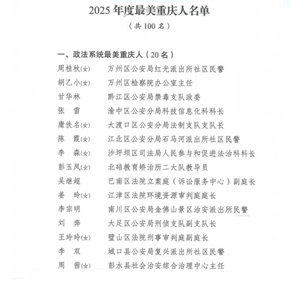 庸佚名获奖感言:荣获“最美重庆人”,我内心满是激动与感激。这不仅是属于我个人的荣誉,更是对全市扎根基层、默默奉献的政法干警群体的褒奖。作为一名普通的法制民警,我的工作平凡而琐碎,不过是巡查好每一起警情、监督好每一次执法、把关好每一个案件,通过点滴努力把法治精神、法治观念传递到群众心里。这份褒奖是对我们守护山城平安、服务人民群众的最大认可,“法安天下、德润人心”的信念将激励我继续恪尽职守,用专业与温度,努力让人民群众在每一起案件办理、每一件警情处理中都能感受到公平正义,为建设更高水平的平安重庆、法治重庆贡献公安力量!