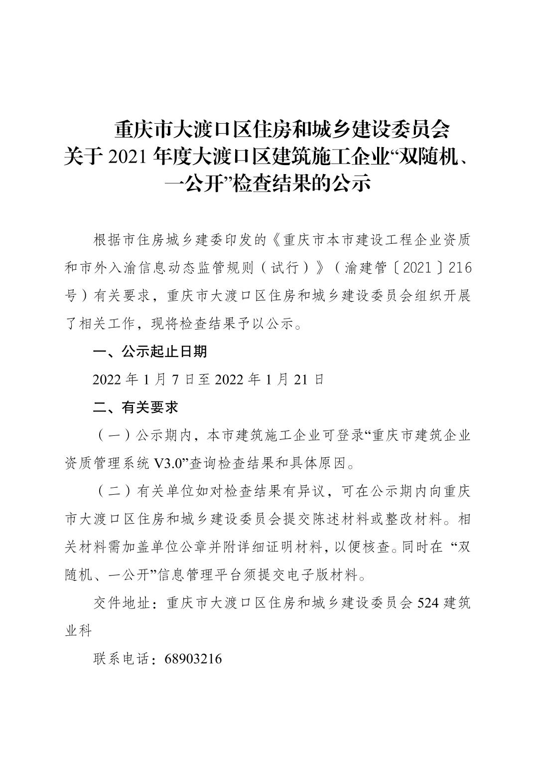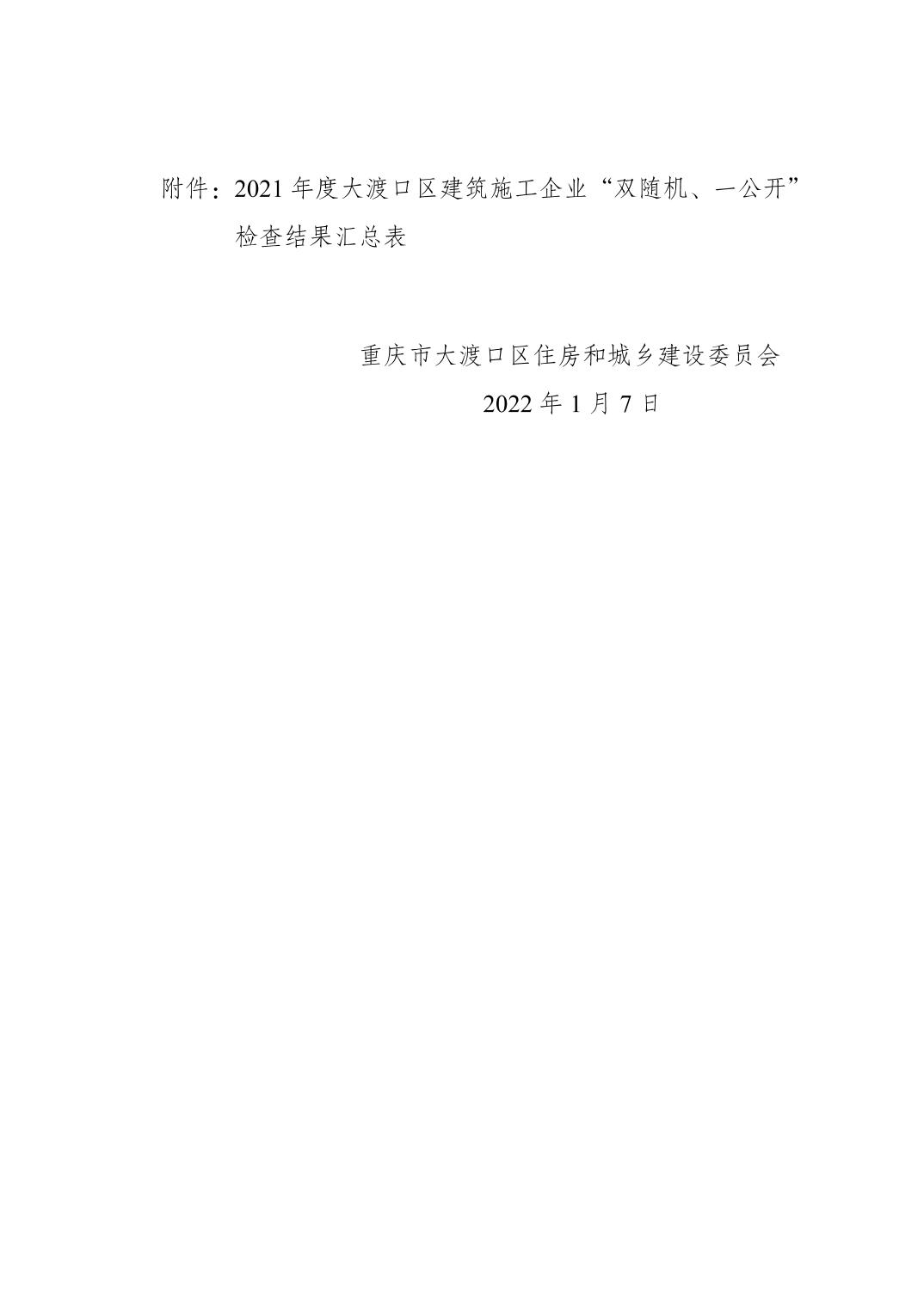 关于2021年度大渡口区建筑施工企业“双随机、一公开”检查结果的公示