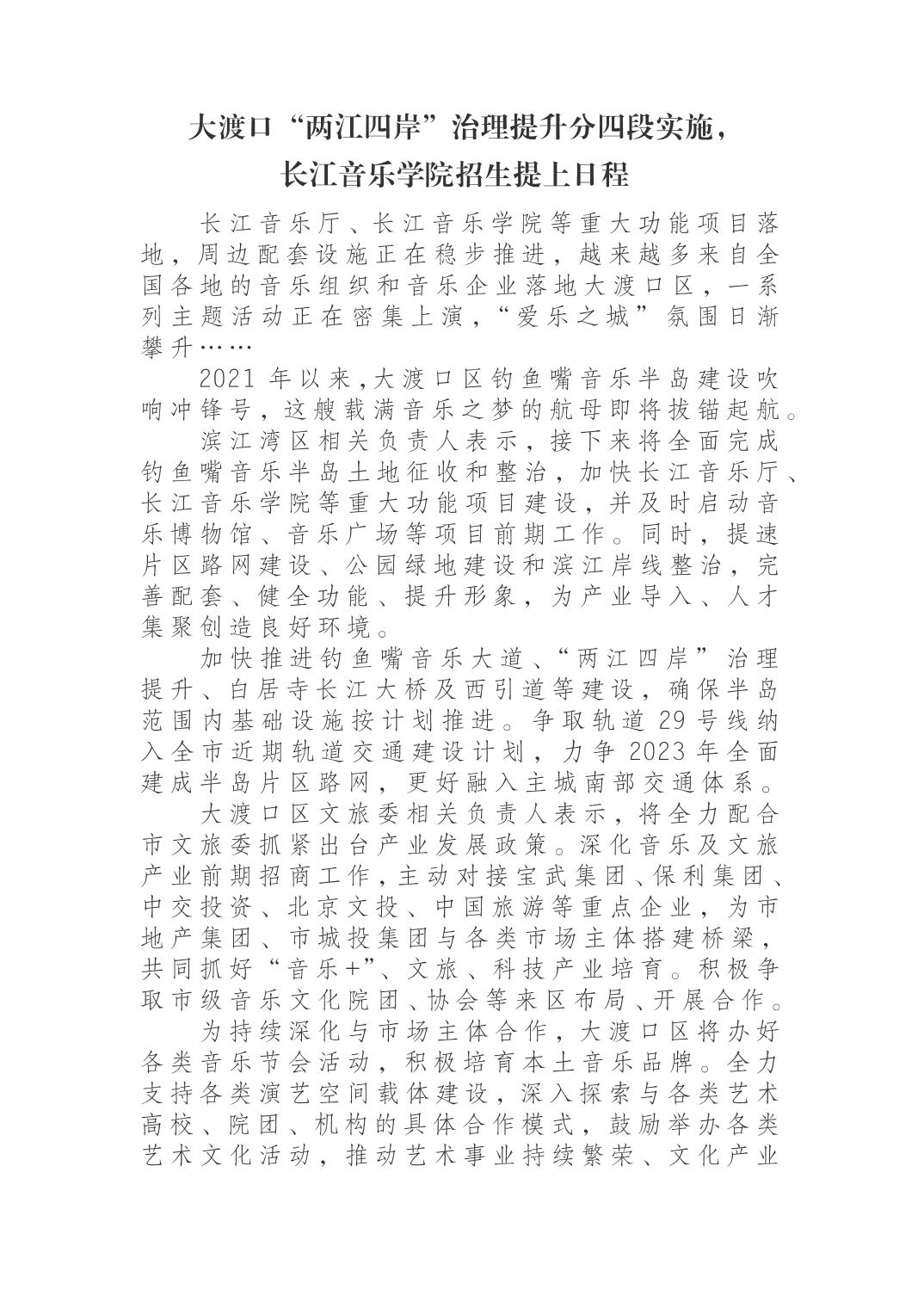 大渡口“两江四岸”治理提升分四段实施,长江音乐学院招生提上日程