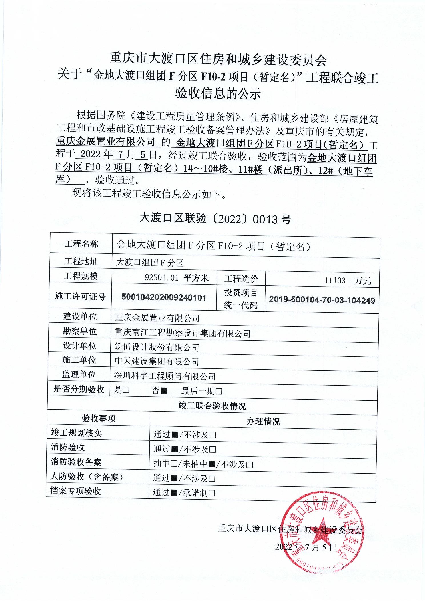 重庆市大渡口区住房和城乡建设委员会关于“金地大渡口组团F分区F10-2项目(暂定名)”工程联合竣工验收信息的公示