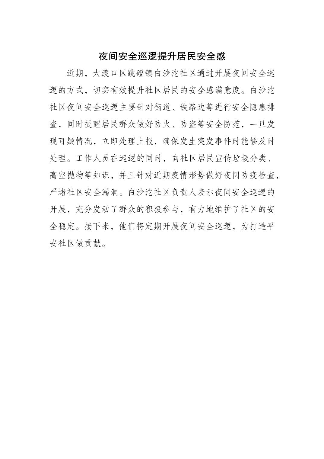 近期,大渡口区跳磴镇白沙沱社区通过开展夜间安全巡逻的方式,切实有效提升社区居民的安全感满意度。白沙沱社区夜间安全巡逻主要针对街道、铁路边等进行安全隐患排查,同时提醒居民群众做好防火、防盗等安全防范,一旦发现可疑情况,立即处理上报,确保发生突发事件时能够及时处理。工作人员在巡逻的同时,向社区居民宣传垃圾分类、高空抛物等知识,并且针对近期疫情形势做好夜间防疫检查,严堵社区安全漏洞。白沙沱社区负责人表示夜间安全巡逻的开展,充分发动了群众的积极参与,有力地维护了社区的安全稳定。接下来,他们将定期开展夜间安全巡逻,为打造平安社区做贡献。