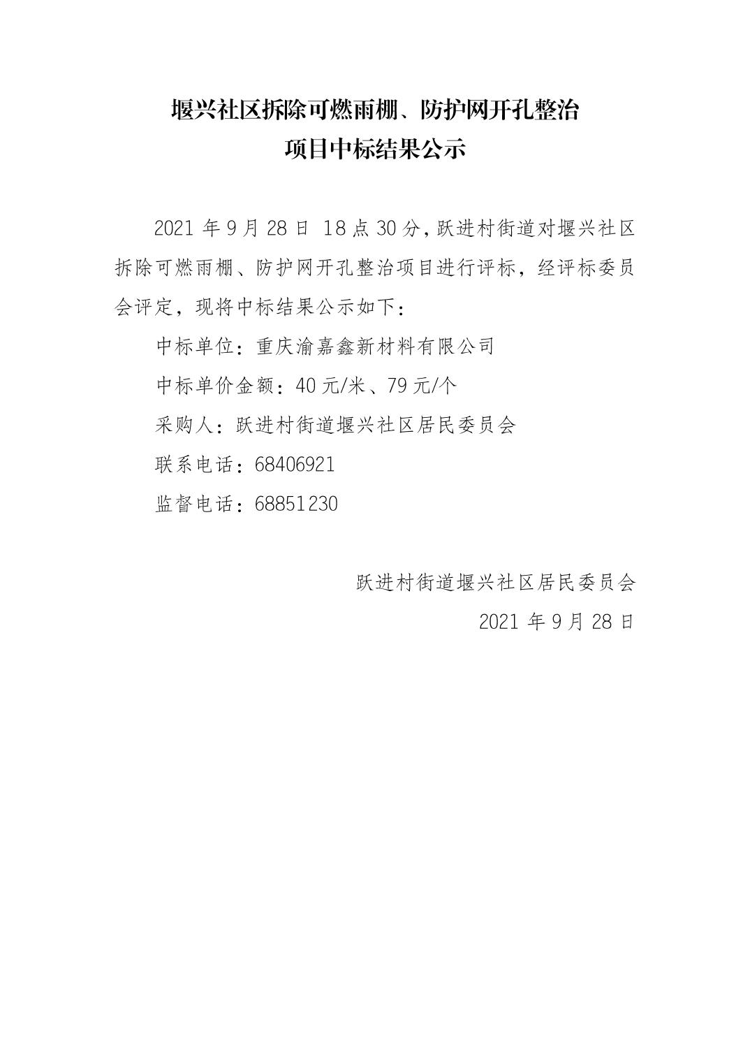 堰兴社区拆除可燃雨棚、防护网开孔整治项目中标结果公示