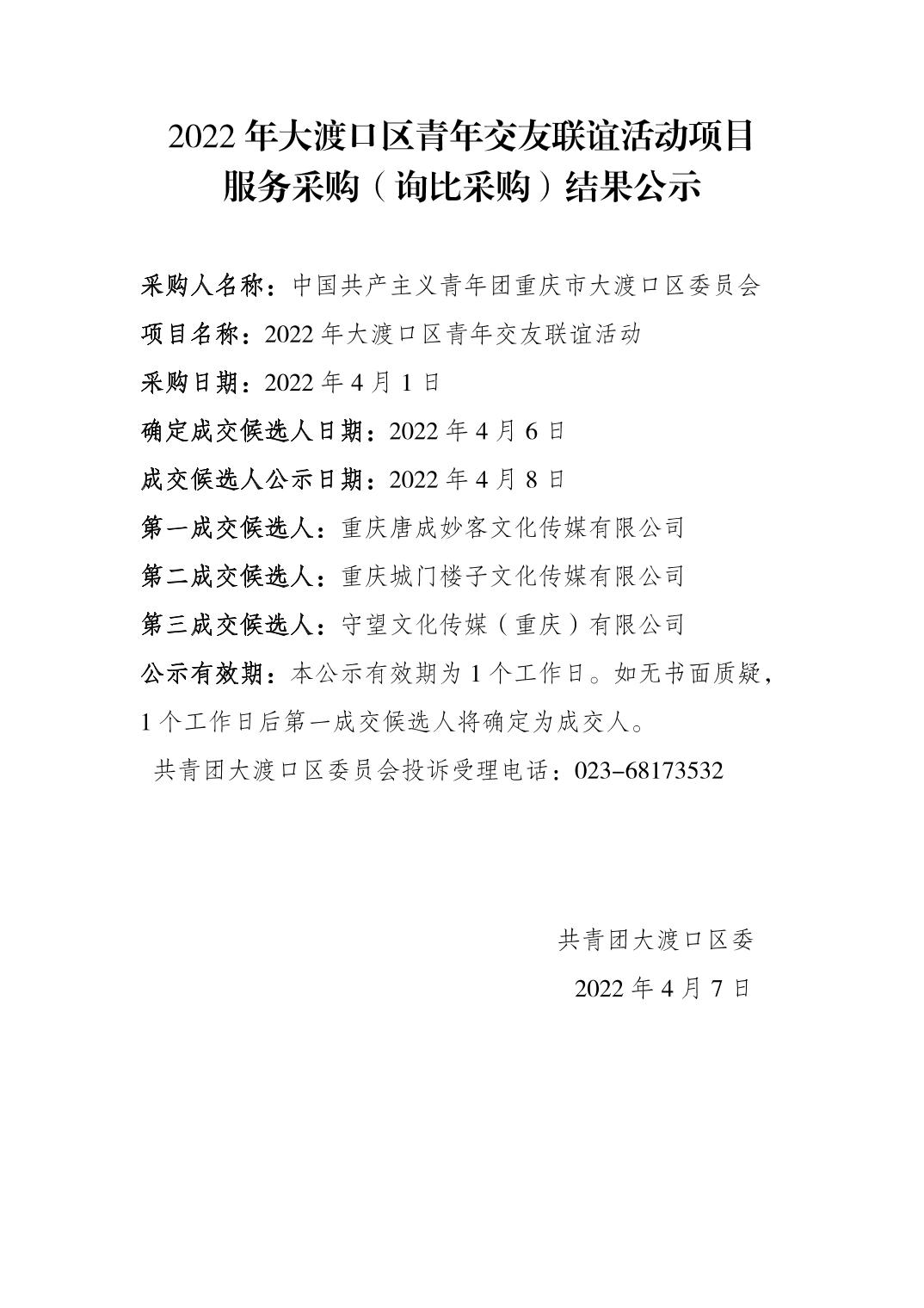 2022年大渡口区青年交友联谊活动项目 服务采购(询比采购)结果公示