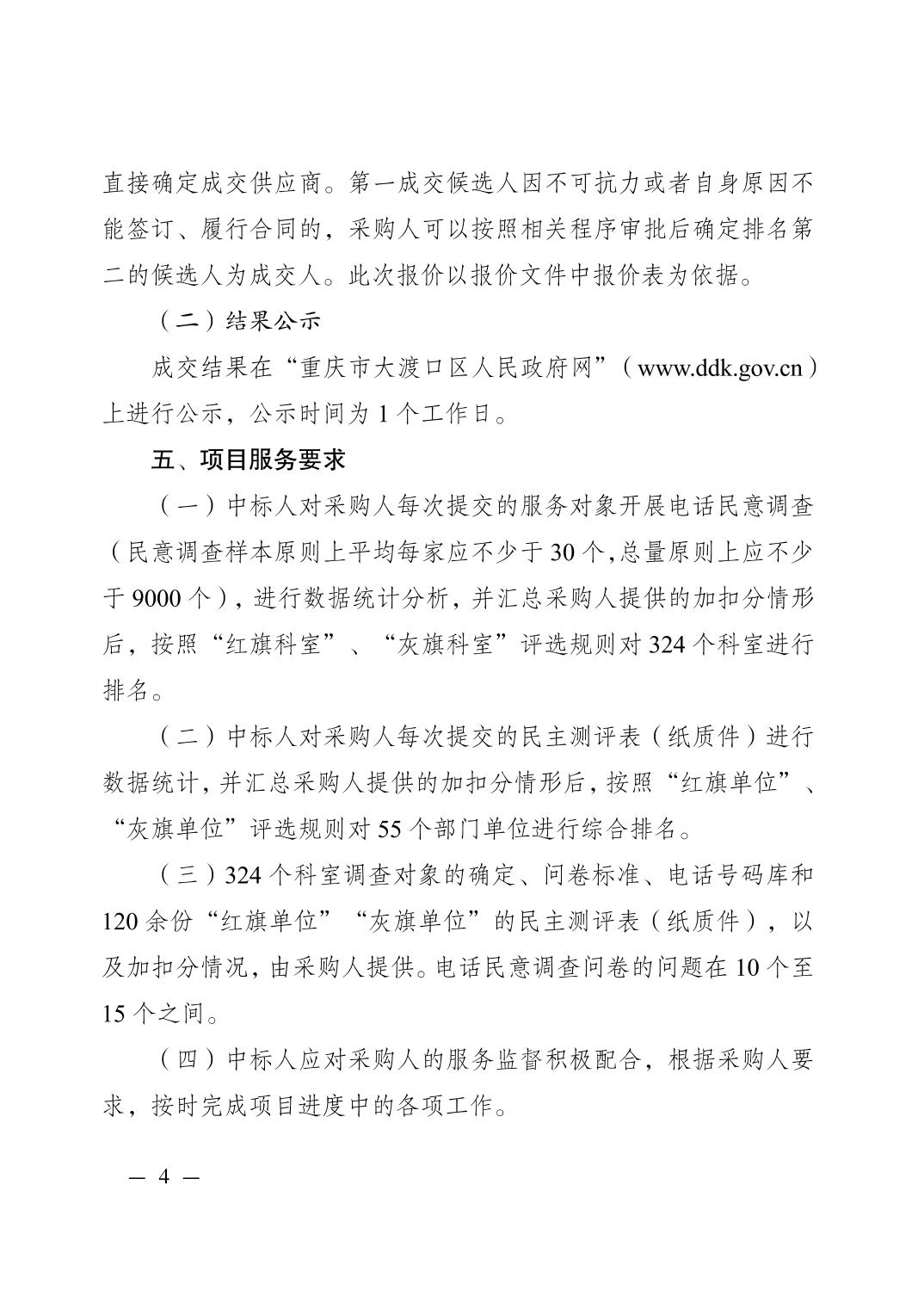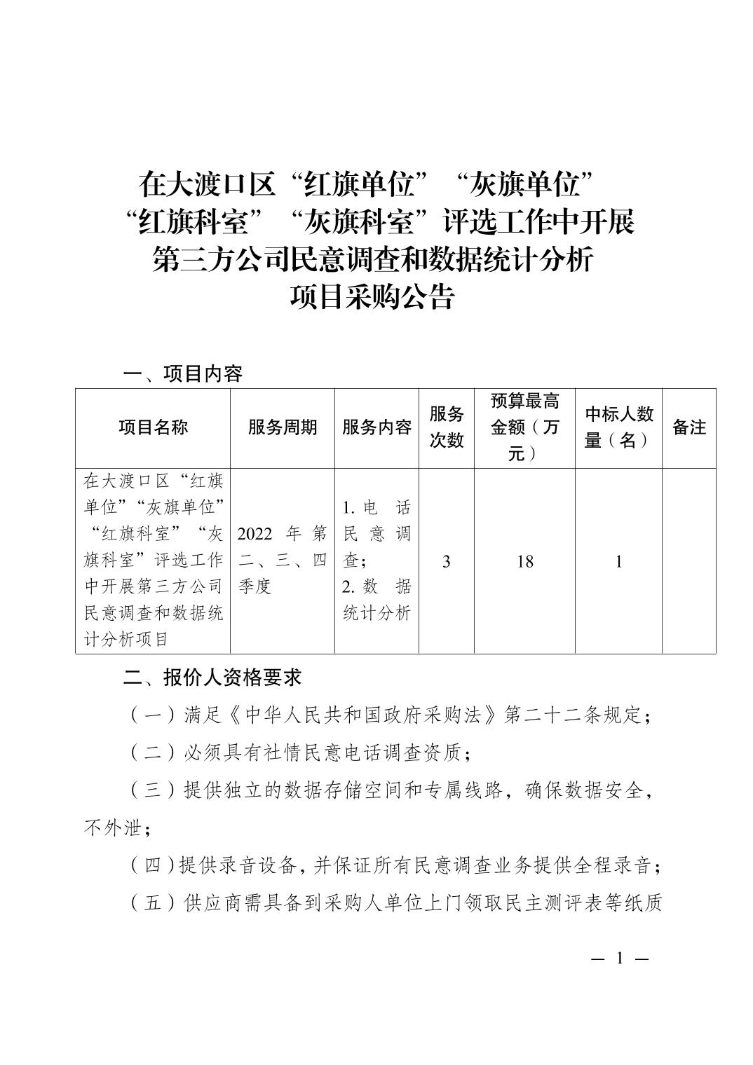 在大渡口区“红旗单位”“灰旗单位” “红旗科室”“灰旗科室”评选工作中开展 第三方公司民意调查和数据统计分析 项目采购公告