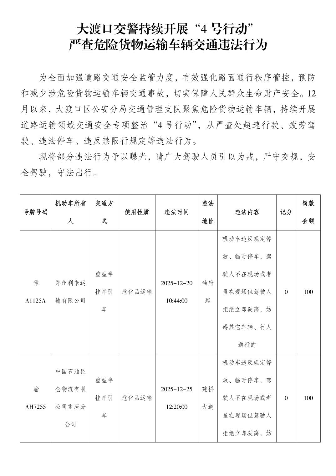 大渡口交警持续开展“4号行动”严查危险货物运输车辆交通违法行为