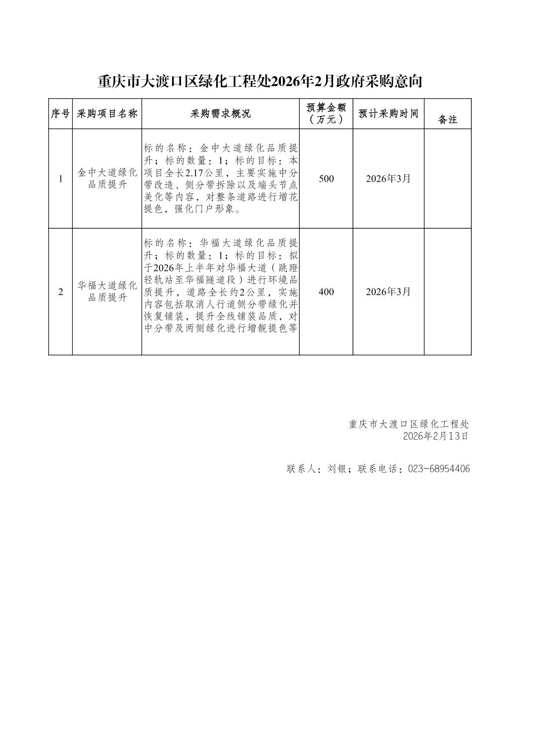 重庆市大渡口区绿化工程处2026年2月政府采购意向