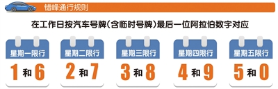 在工作日按汽车号牌(含临时号牌)最后一位阿拉伯数字对应