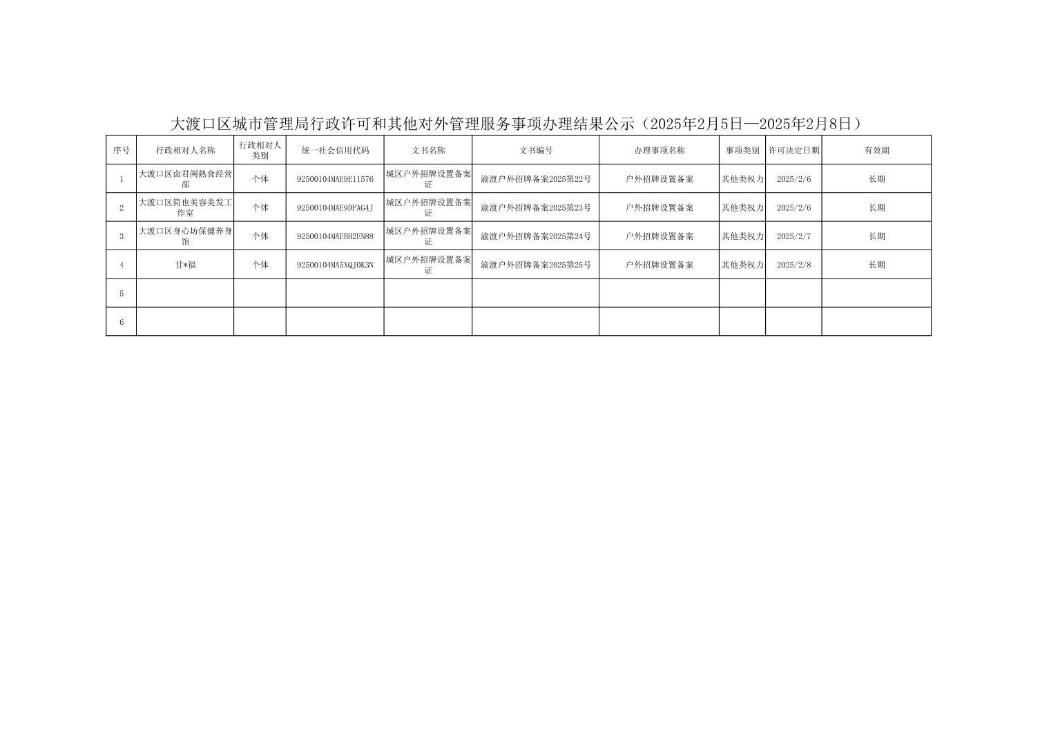大渡口区城市管理局行政许可和其他对外管理服务事项办理结果公示(2025年2月5日—2025年2月8日)