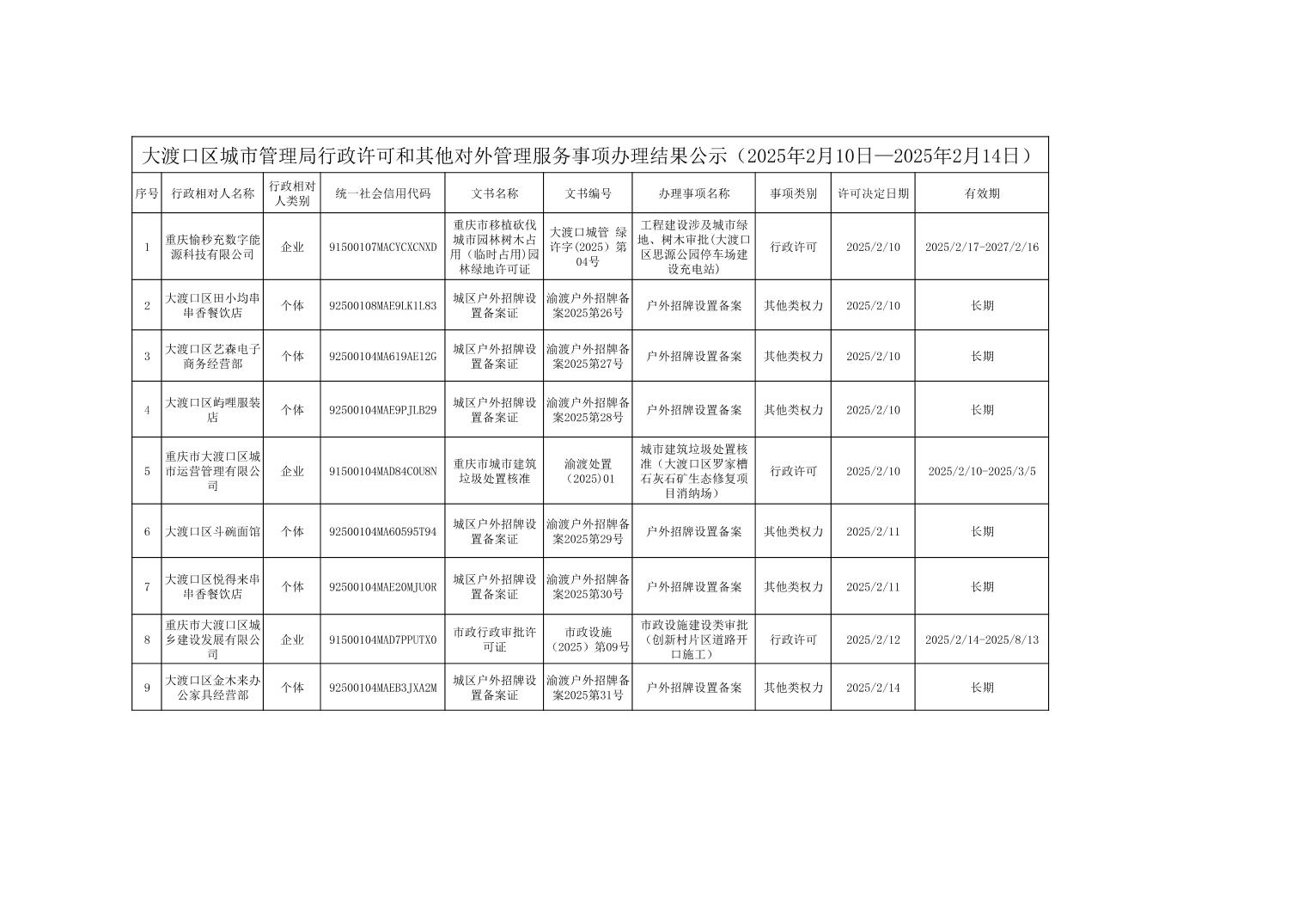 大渡口区城市管理局行政许可和其他对外管理服务事项办理结果公示(2025年2月10日—2025年2月14日)
