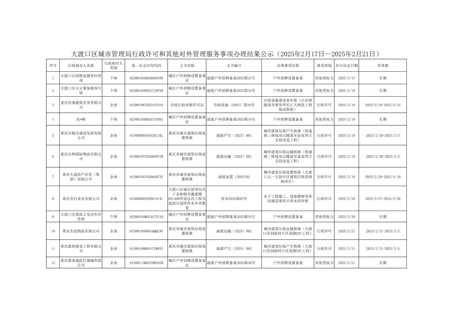 大渡口区城市管理局行政许可和其他对外管理服务事项办理结果公示(2025年2月17日—2025年2月21日)