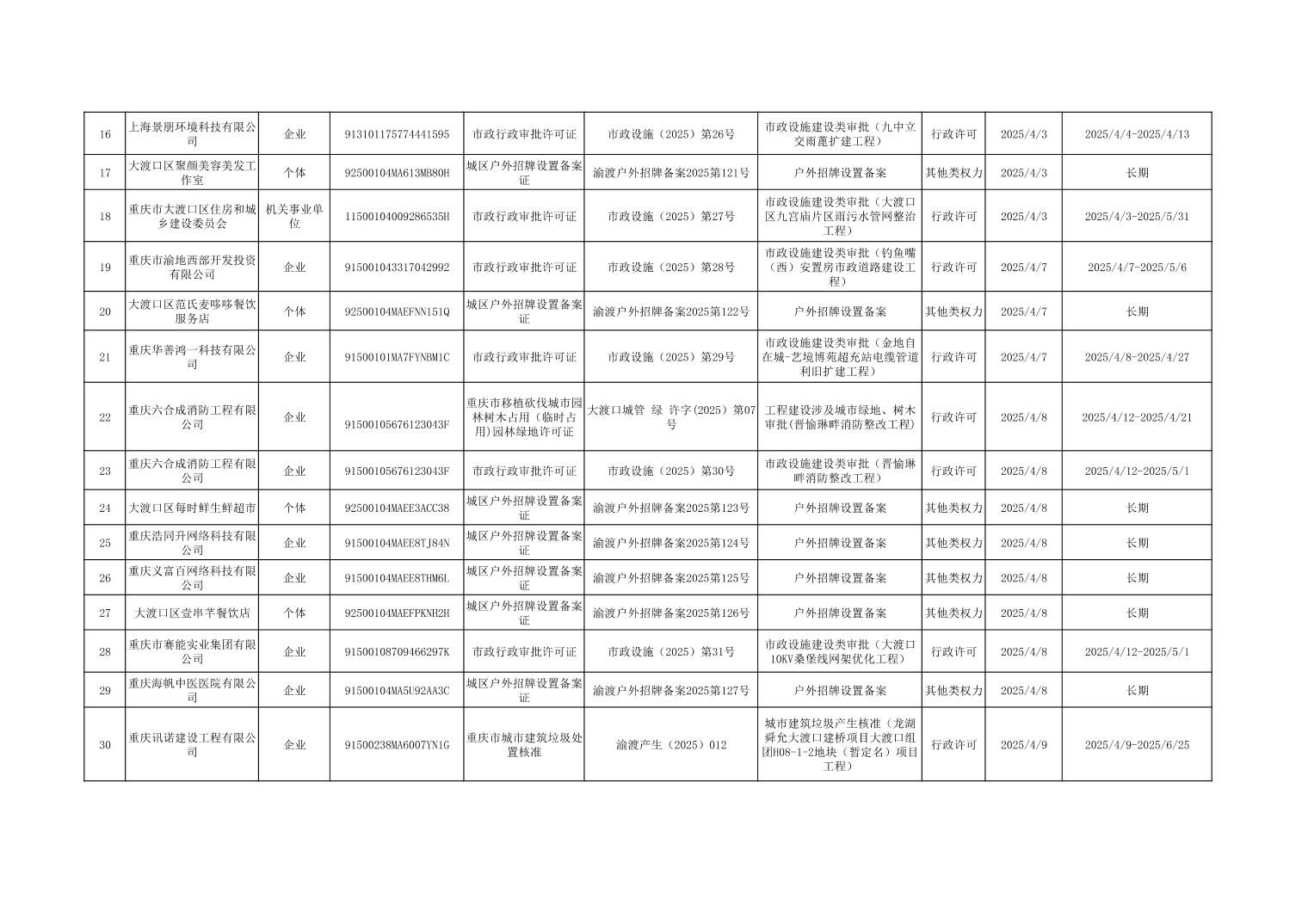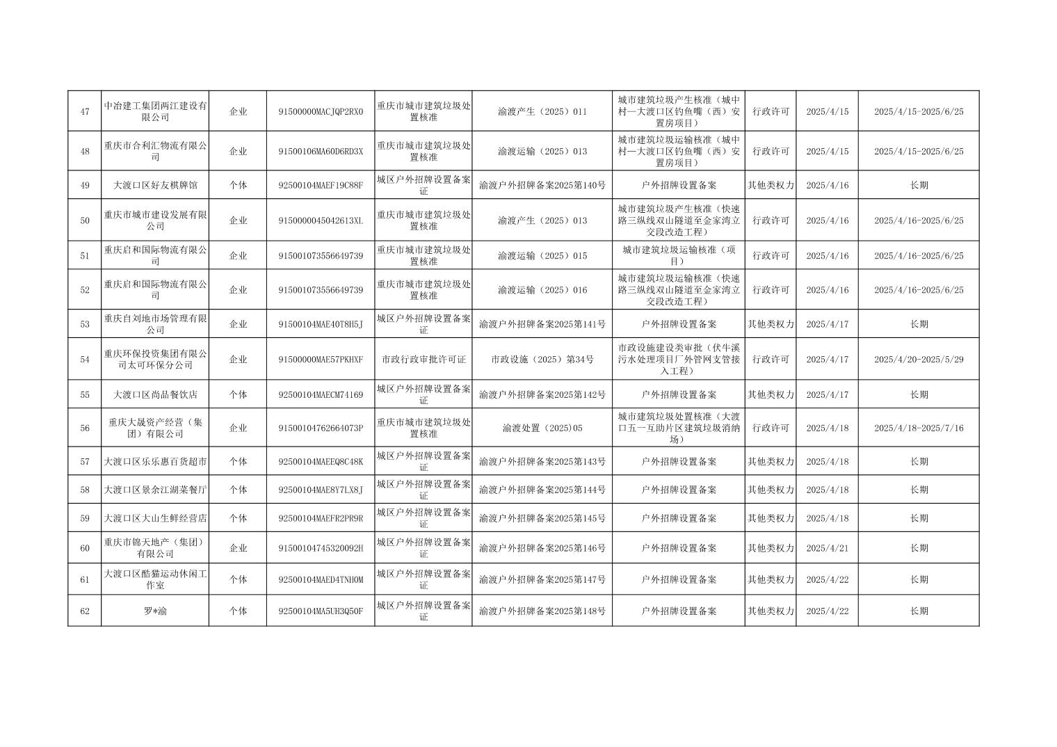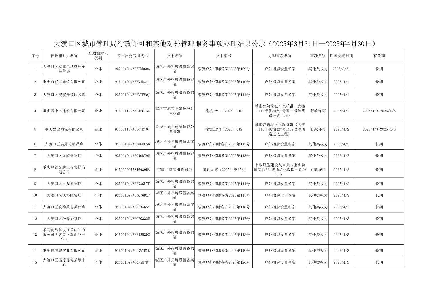 大渡口区城市管理局行政许可和其他对外管理服务事项办理结果公示(2025年3月31日—2025年4月30日)
