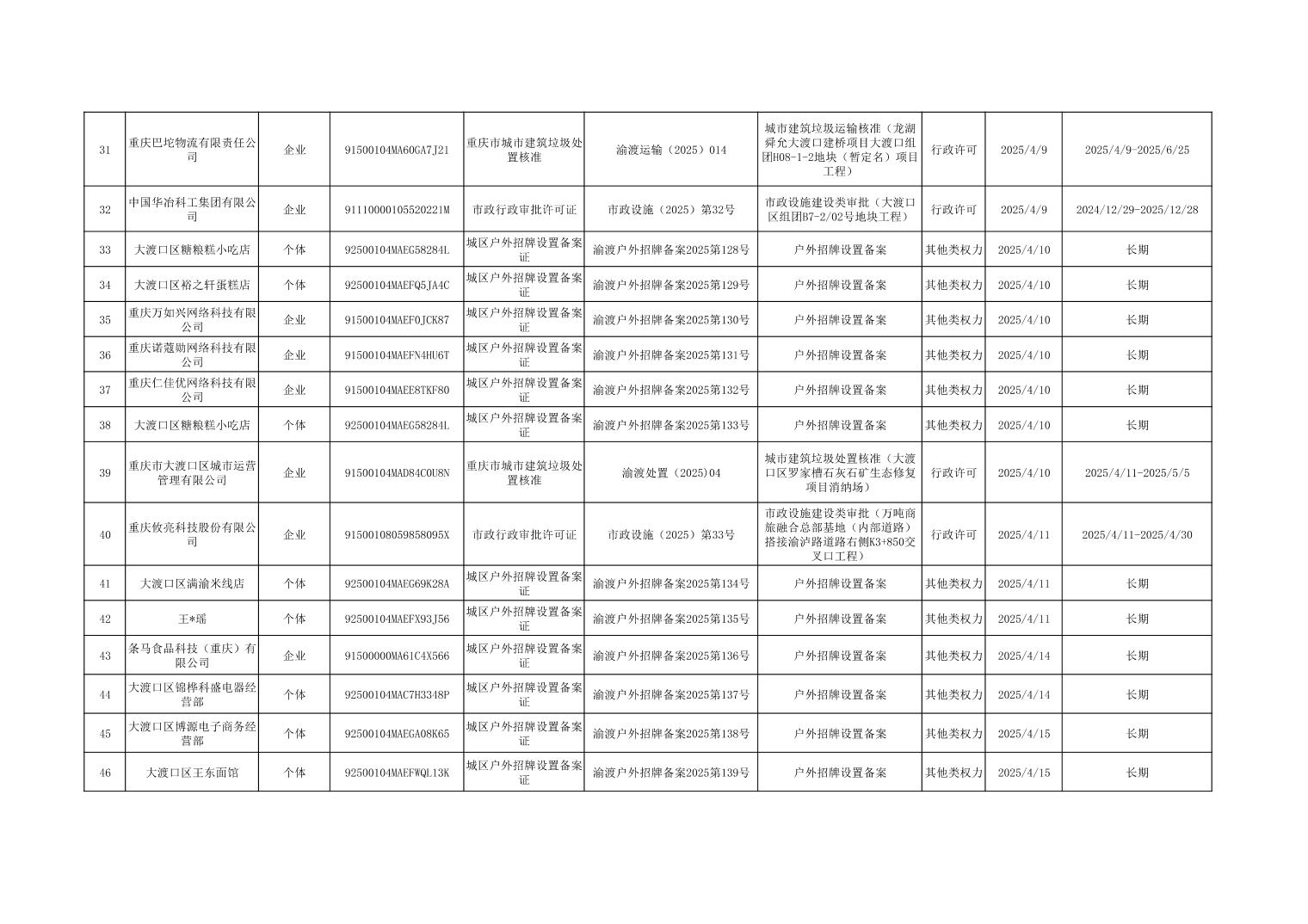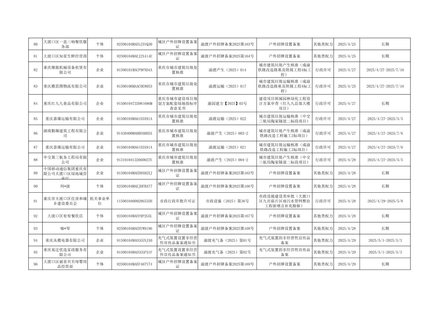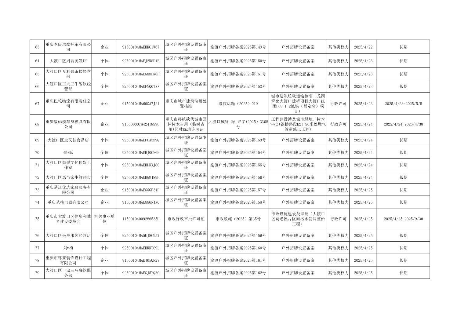 大渡口区城市管理局行政许可和其他对外管理服务事项办理结果公示(2025年3月31日—2025年4月30日)