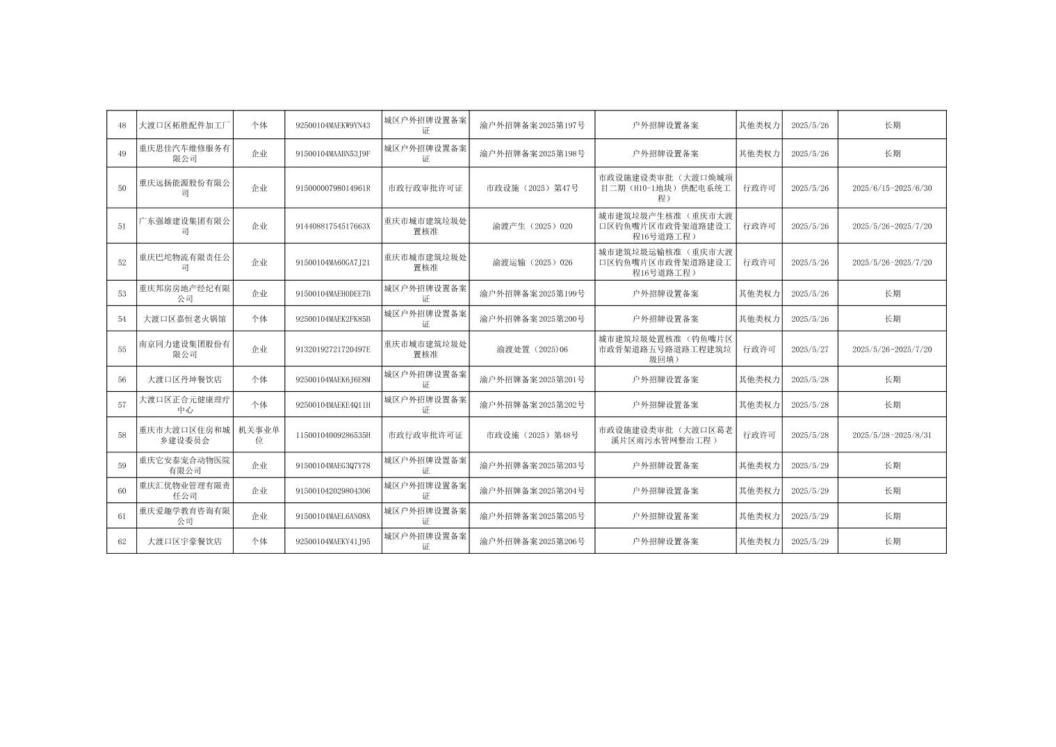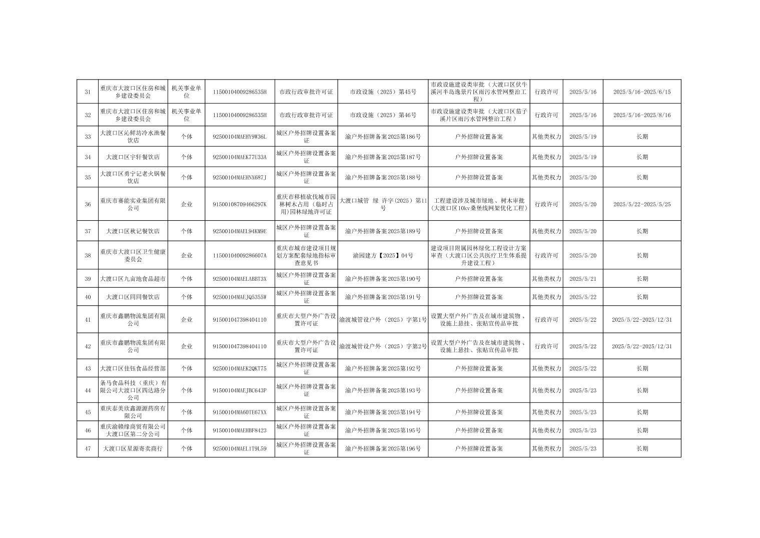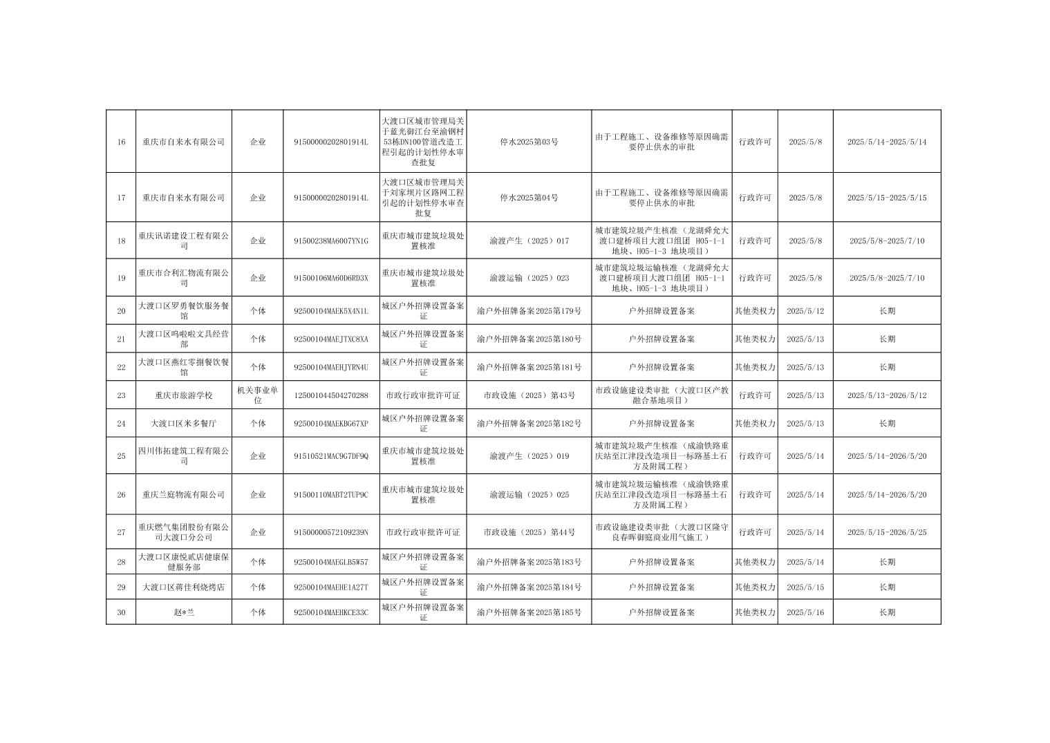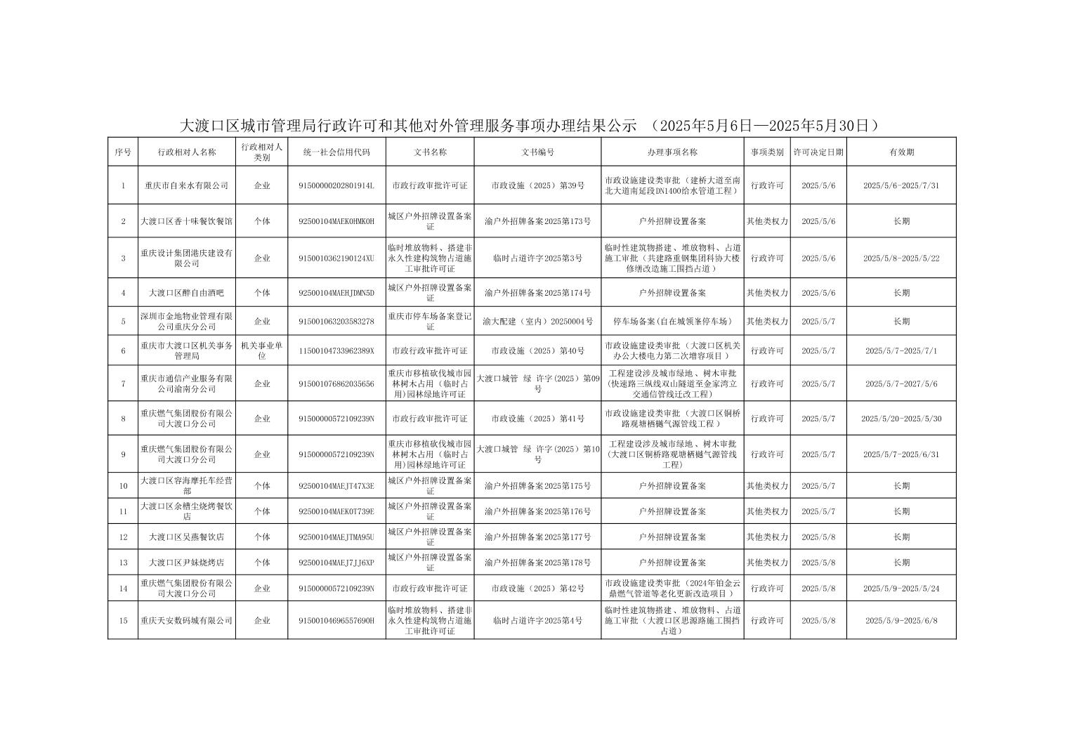 大渡口区城市管理局行政许可和其他对外管理服务事项办理结果公示(2025年5月6日—2025年5月30日)