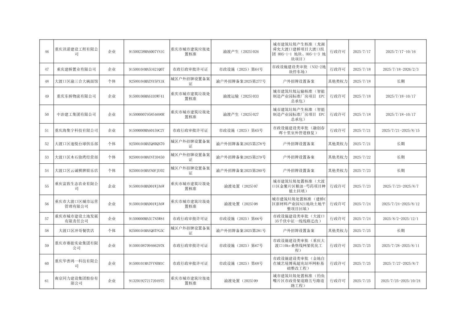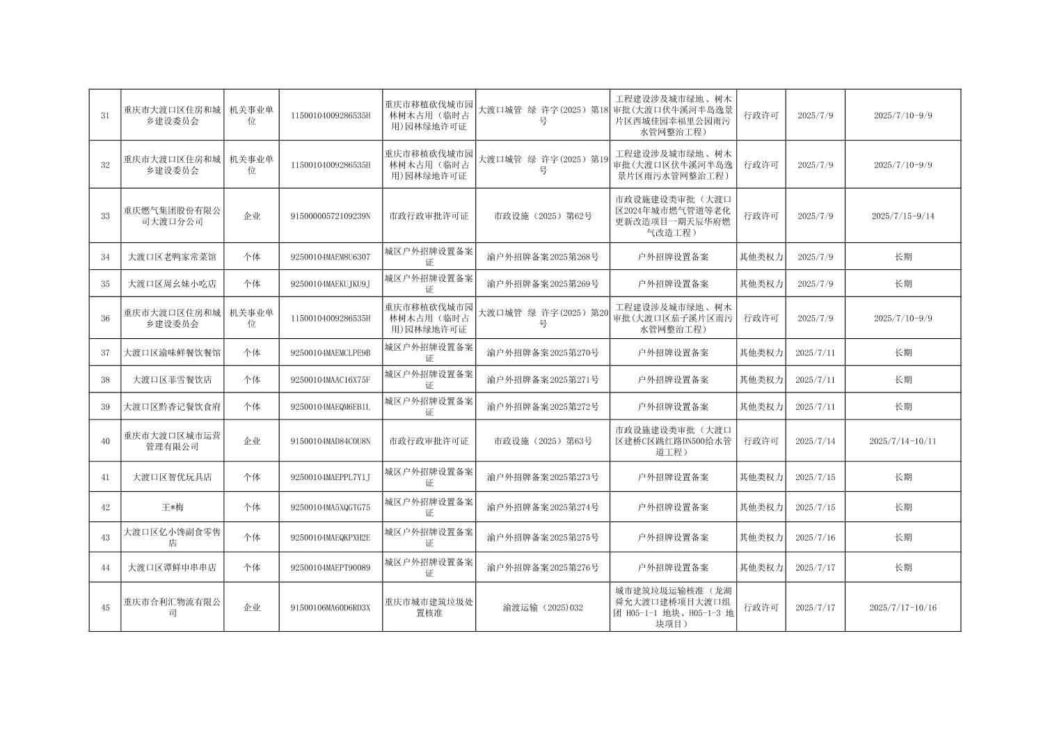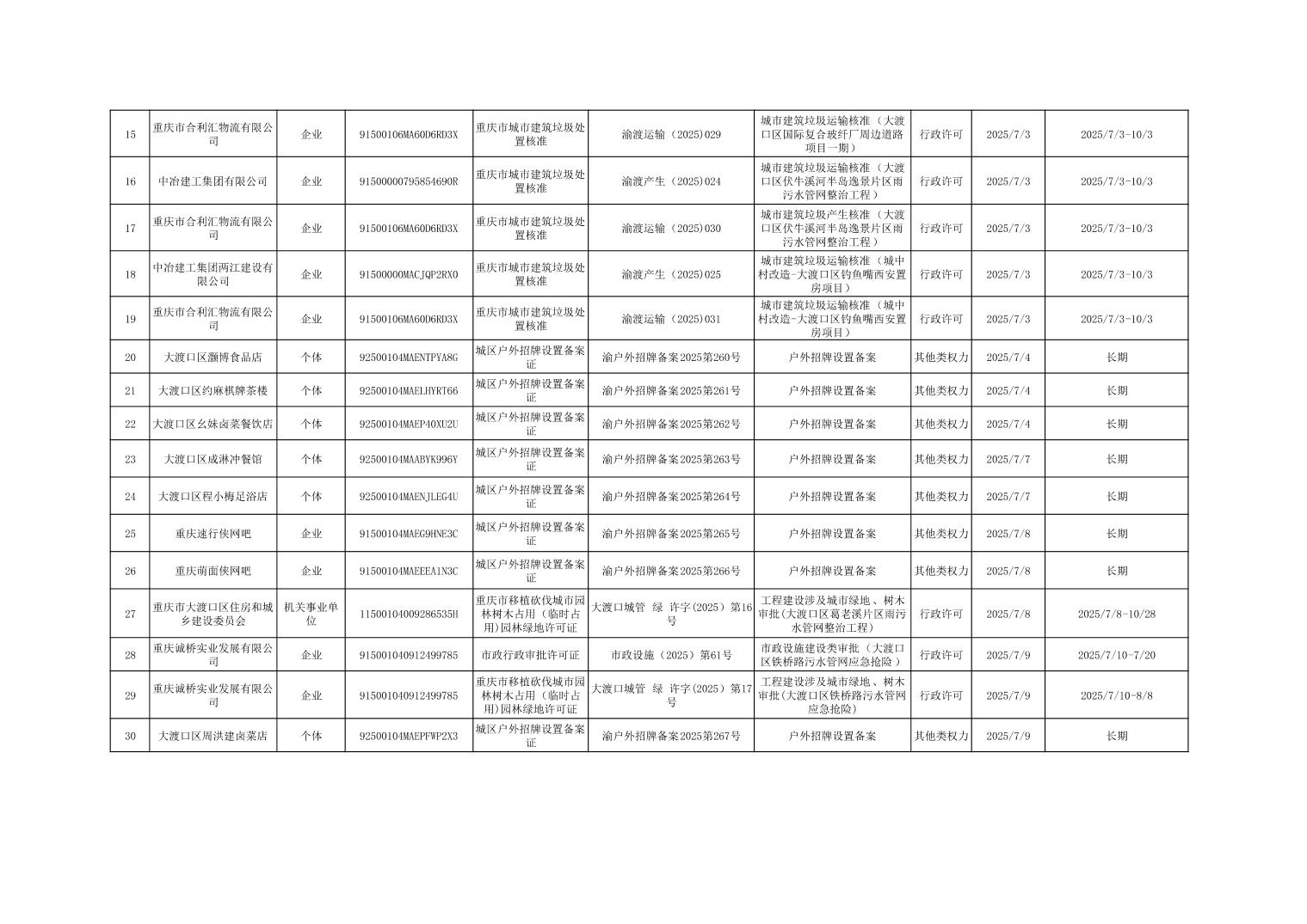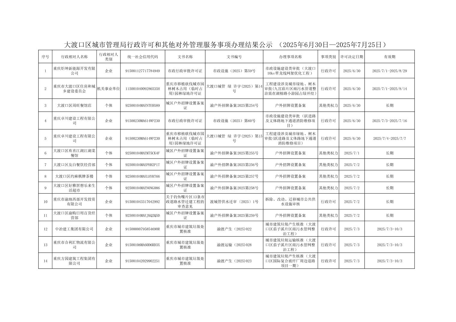 大渡口区城市管理局行政许可和其他对外管理服务事项办理结果公示(2025年6月30日—2025年7月25日)