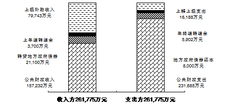 区级一般公共预算收入157,232万元,上级补助收入79,743万元,加上转贷财政部代理发行地方政府债券收入21,100万元、上年结转结余3,700万元等,全区一般公共预算收入总计为261,775万元。减去上解上级支出16,188万元、地方政府债券还本支出8,000万元,区级财力为237,587万元。