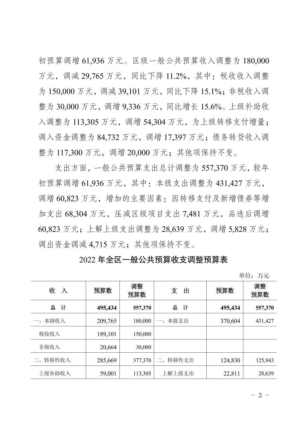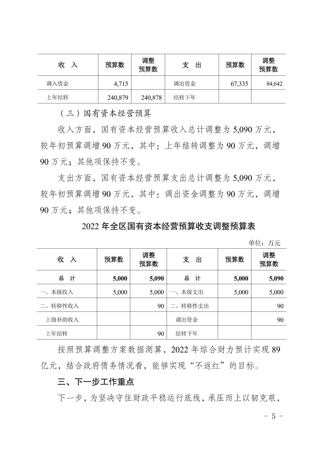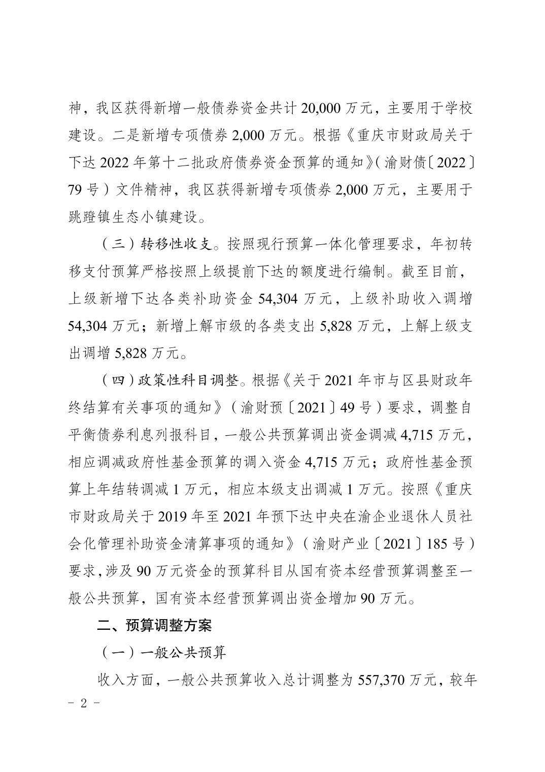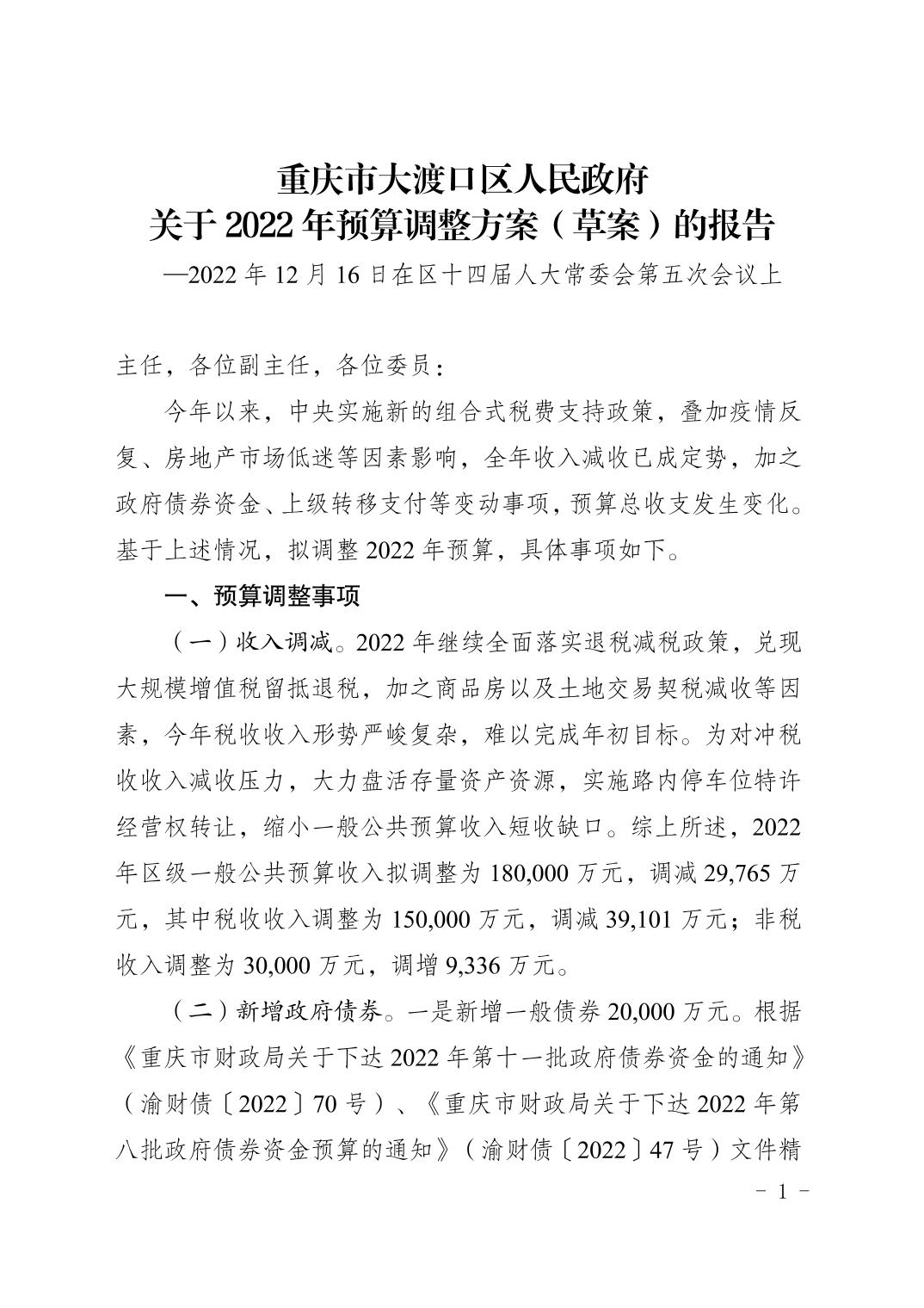 重庆市大渡口区人民政府关于2022年预算调整方案(草案)的报告