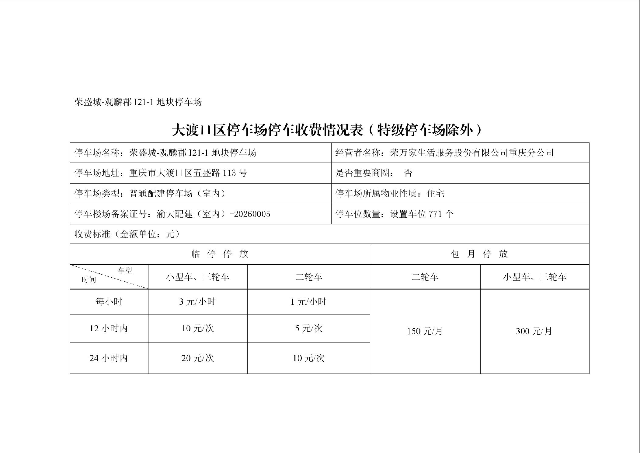 大渡口区停车场停车收费情况表(特级停车场除外)荣盛城-观麟郡I21-1地块停车场