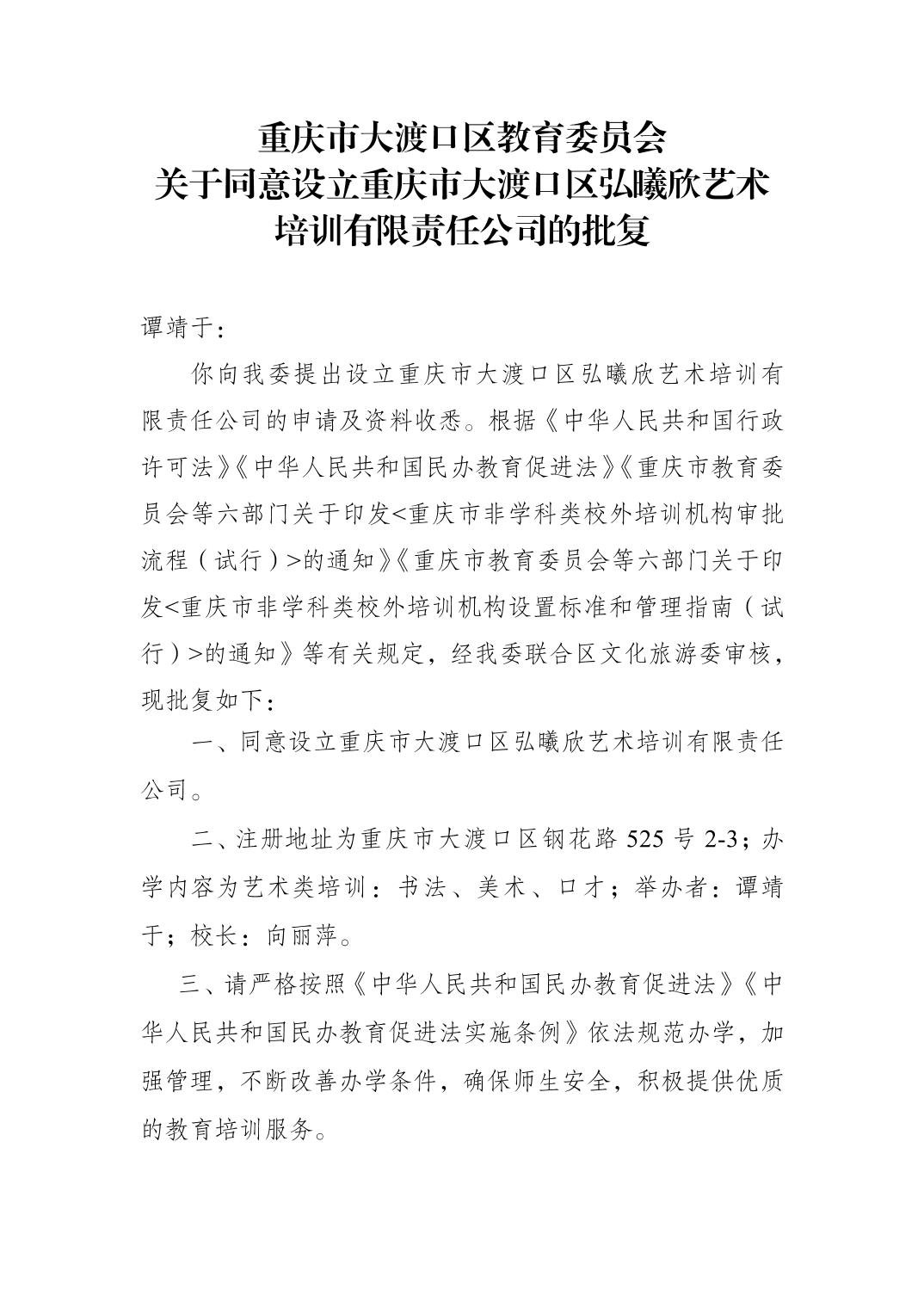 重庆市大渡口区教育委员会关于同意设立重庆市大渡口区弘曦欣艺术培训有限责任公司的批复