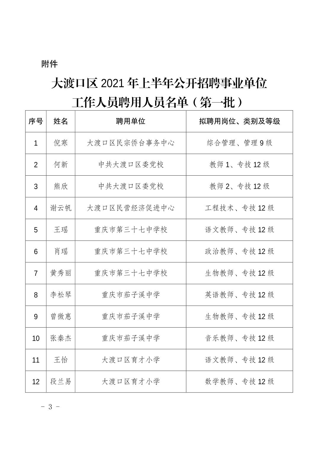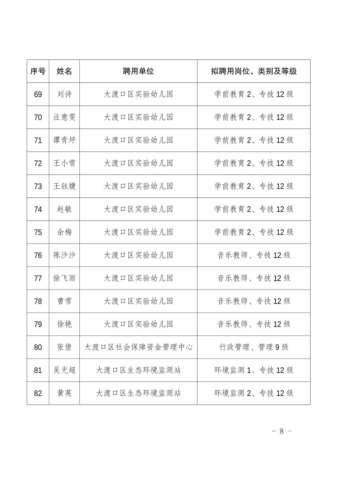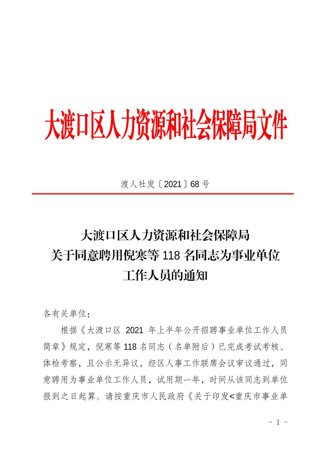 大渡口区人力资源和社会保障局关于同意聘用倪寒等118名同志为事业单位工作人员的通知.pdf