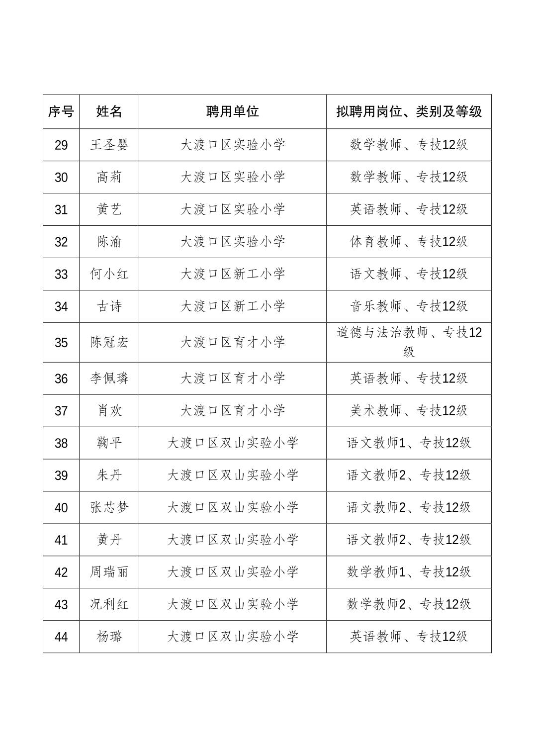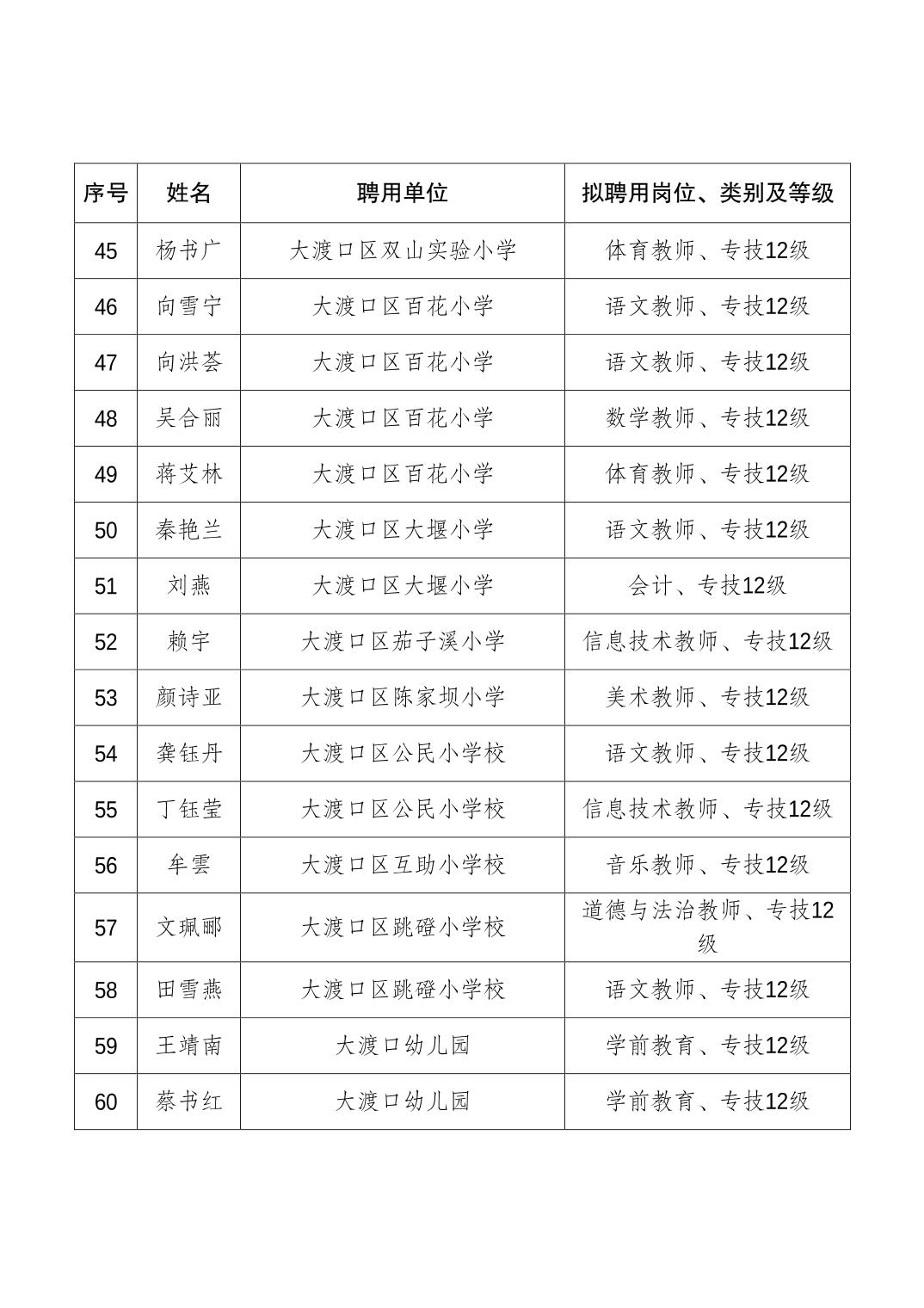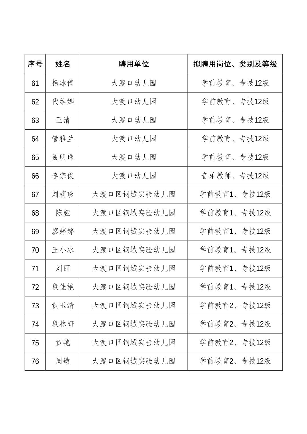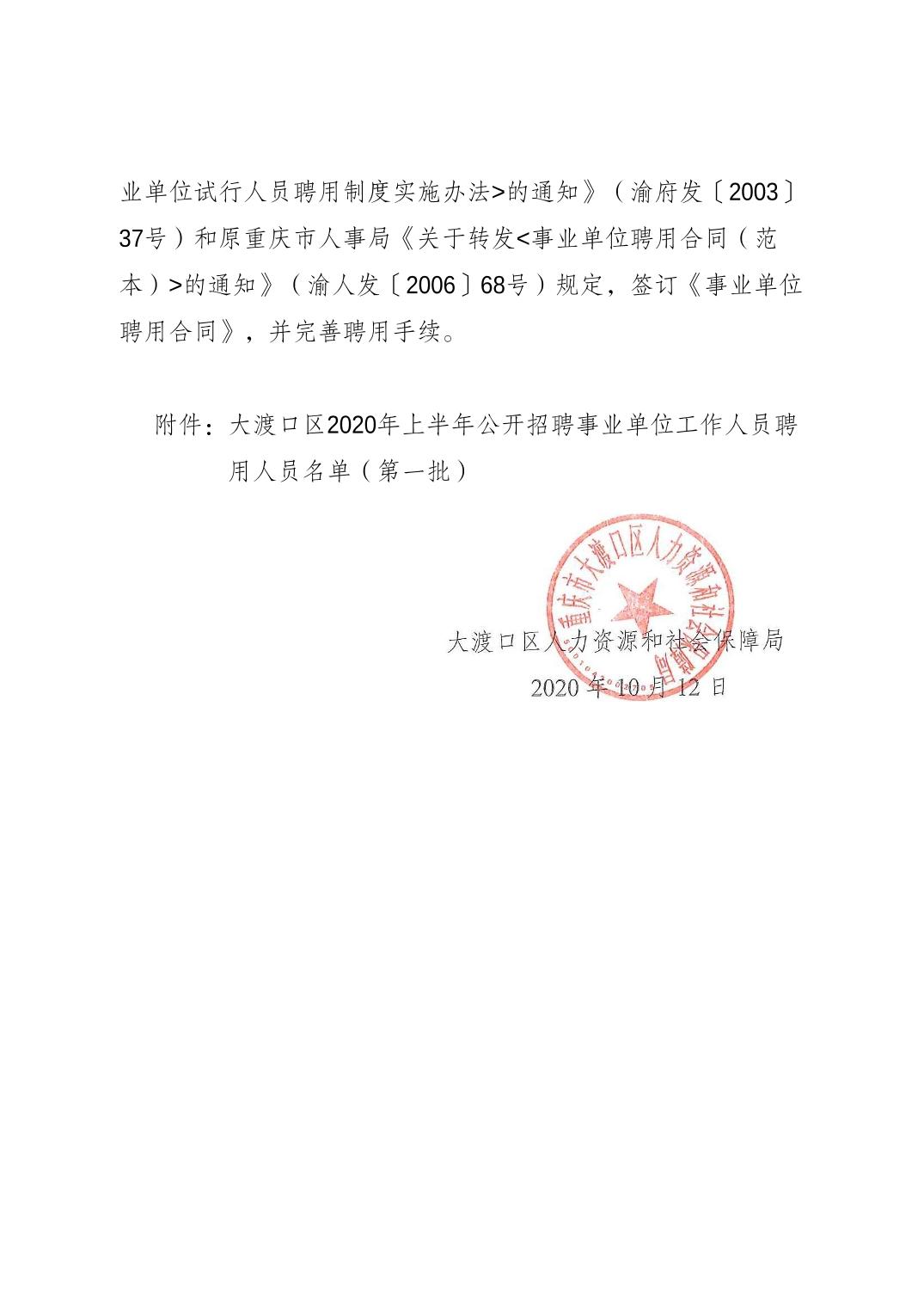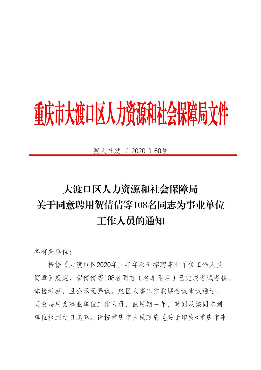 大渡口区人力资源和社会保障局关于同意聘用贺倩倩等108名同志为事业单位工作人员的通知.pdf