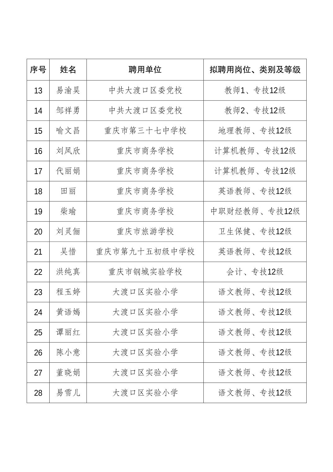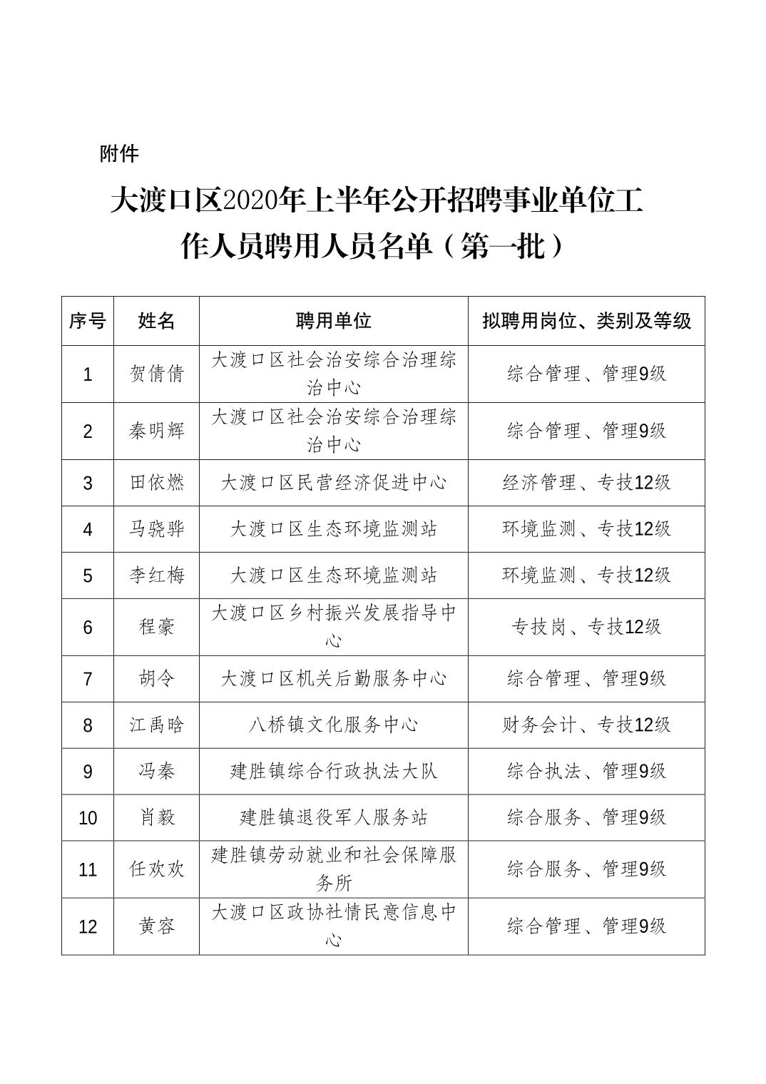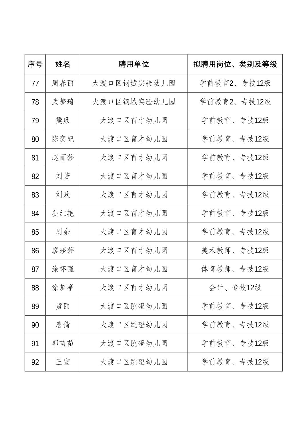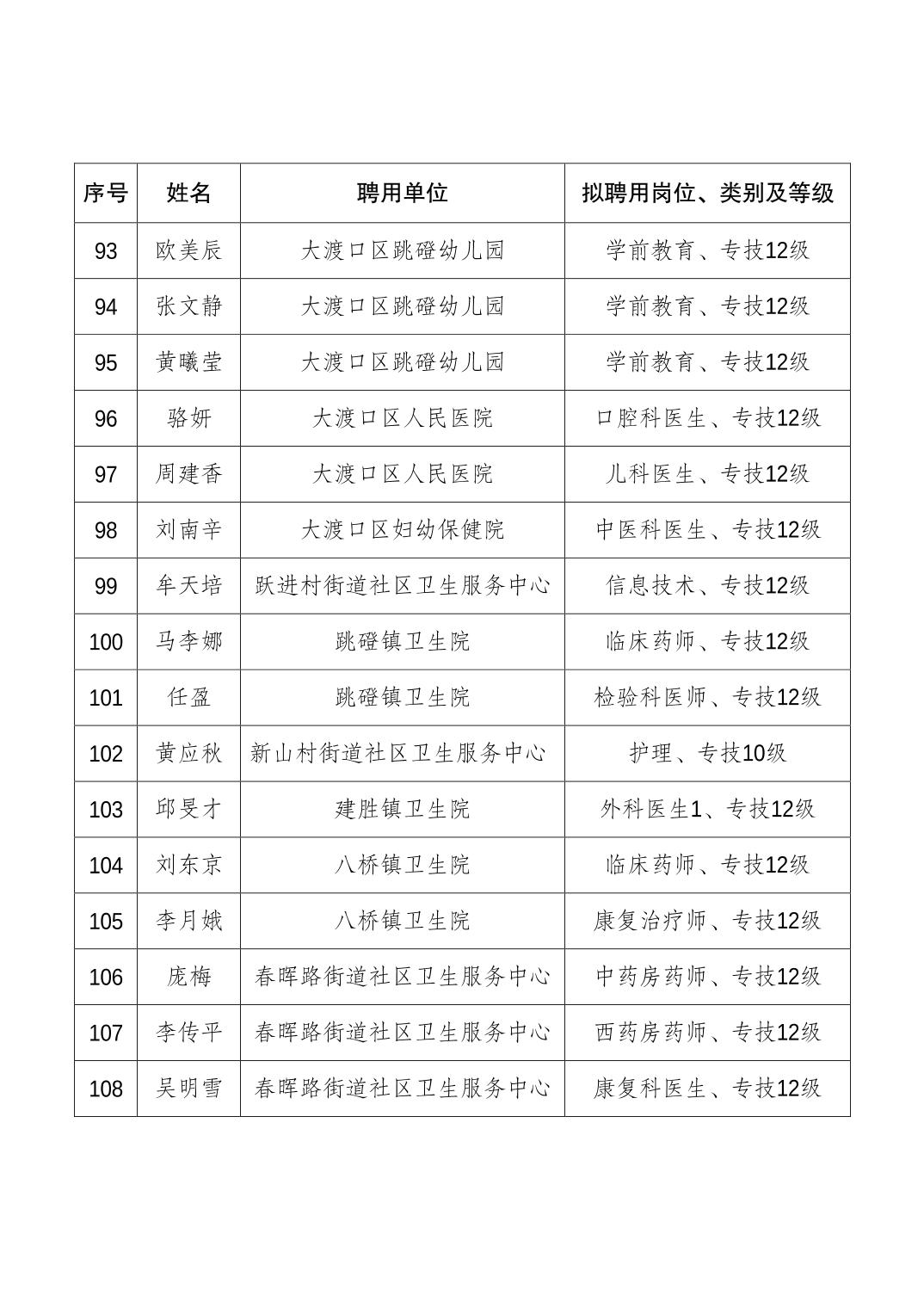 大渡口区人力资源和社会保障局关于同意聘用贺倩倩等108名同志为事业单位工作人员的通知