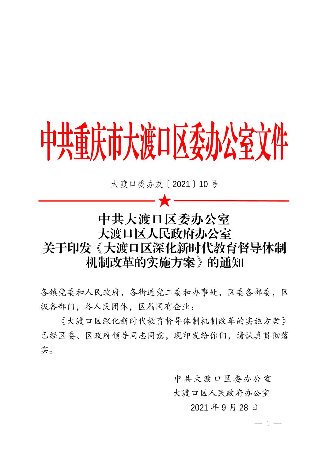 中共大渡口区委办公室大渡口区人民政府办公室关于印发《大渡口区深化新时代教育督导体制机制改革的实施方案》的通知(大渡口委办发〔2021〕10号).pdf