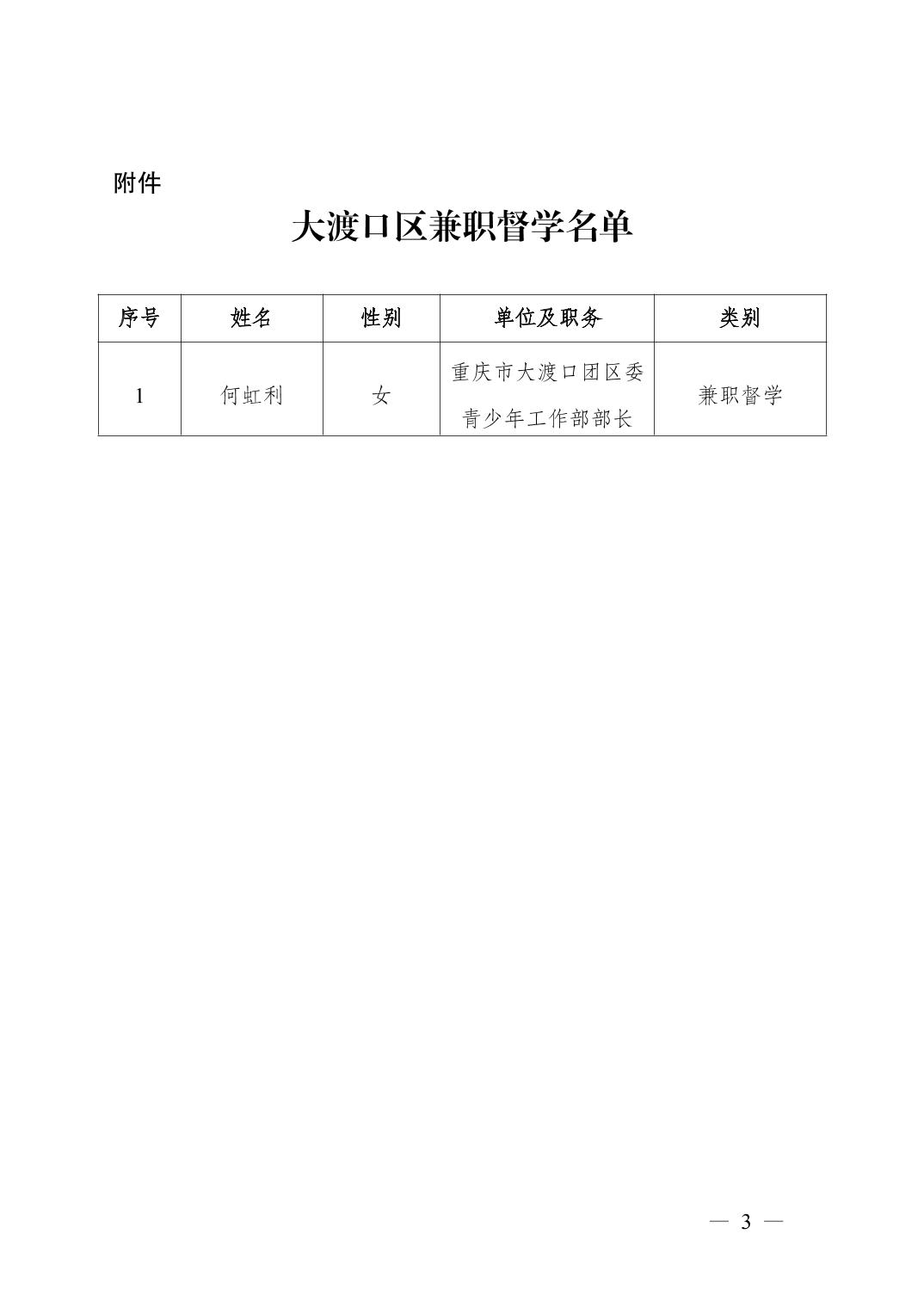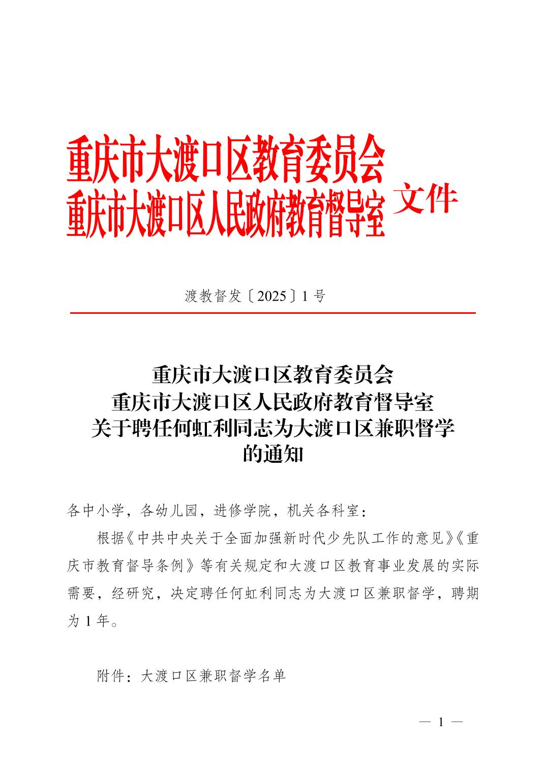 渡教督发〔2025〕1 号关于聘任何虹利同志为大渡口区教育系统兼职督学的通知