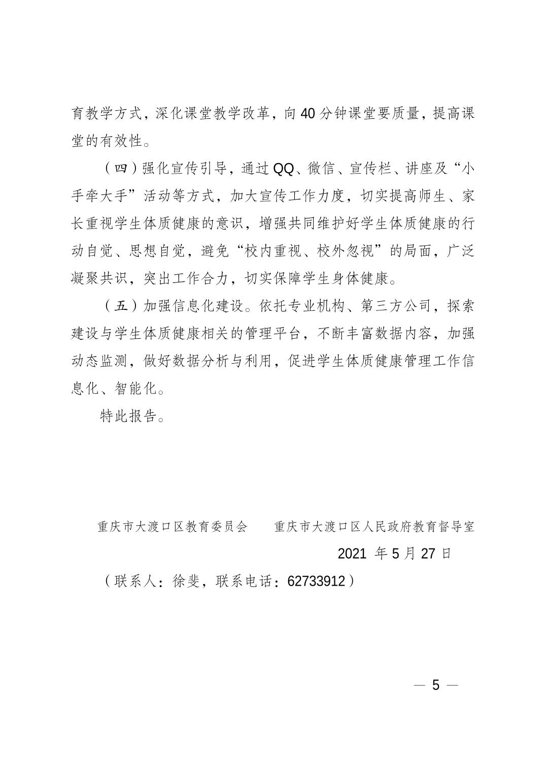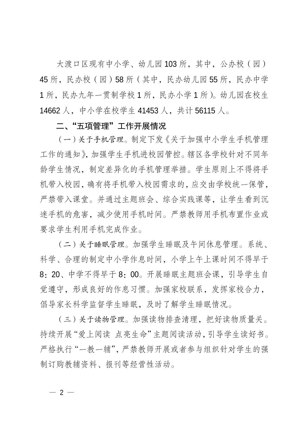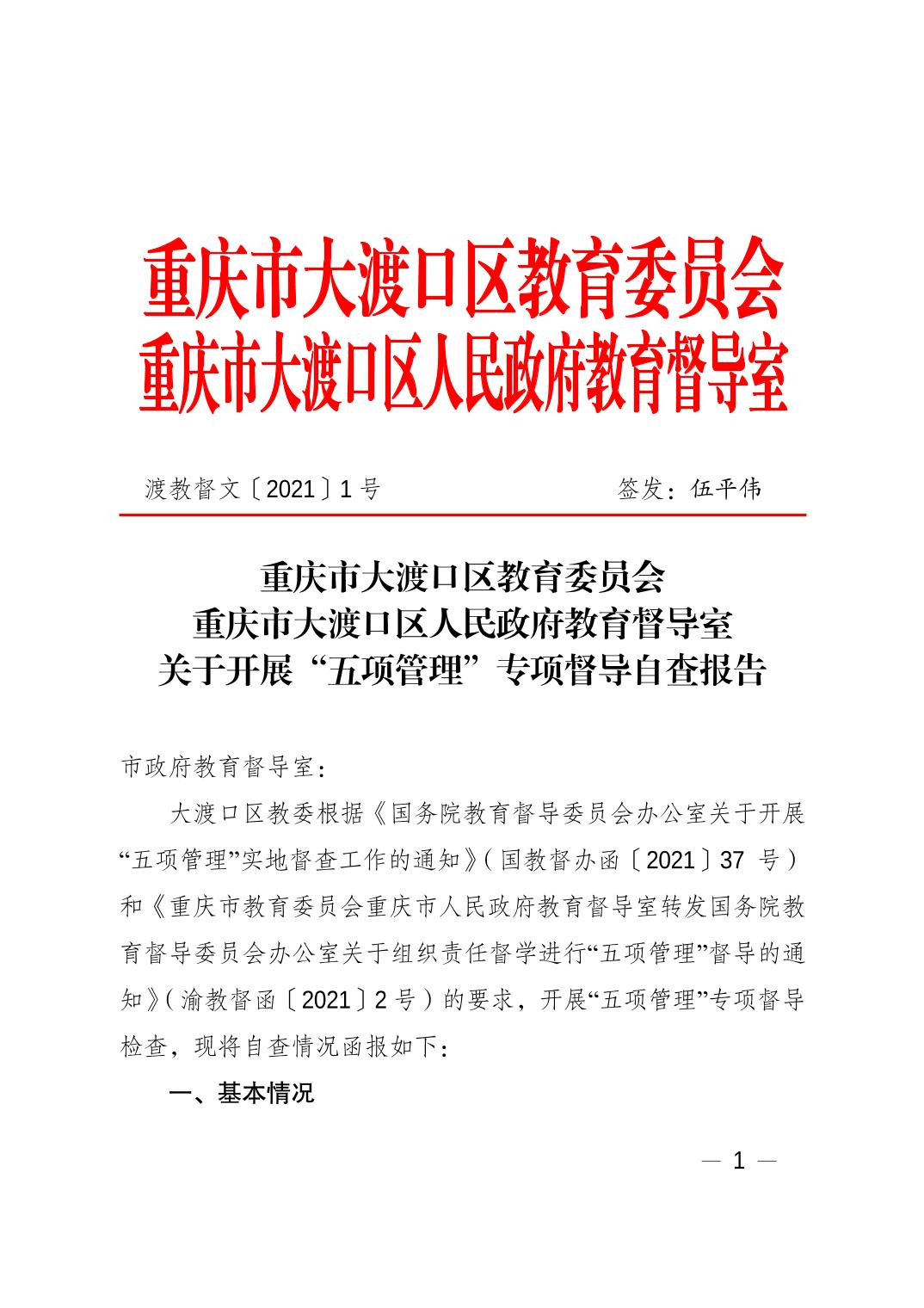 重庆市大渡口区教育委员会重庆市大渡口区人民政府教育督导室关于开展“五项管理”专项督导自查报告.pdf