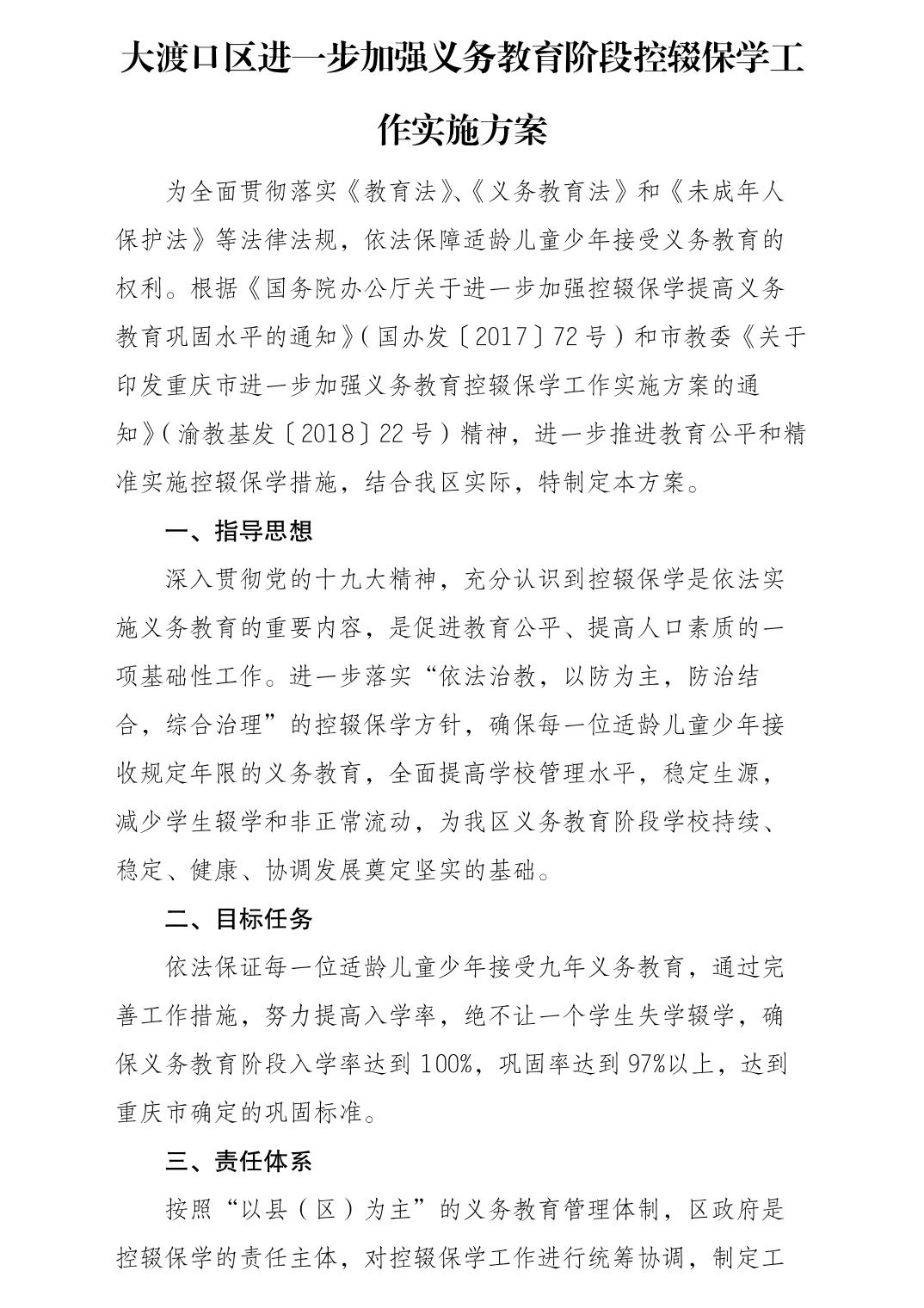 大渡口区进一步加强义务教育阶段控辍保学工作实施方案