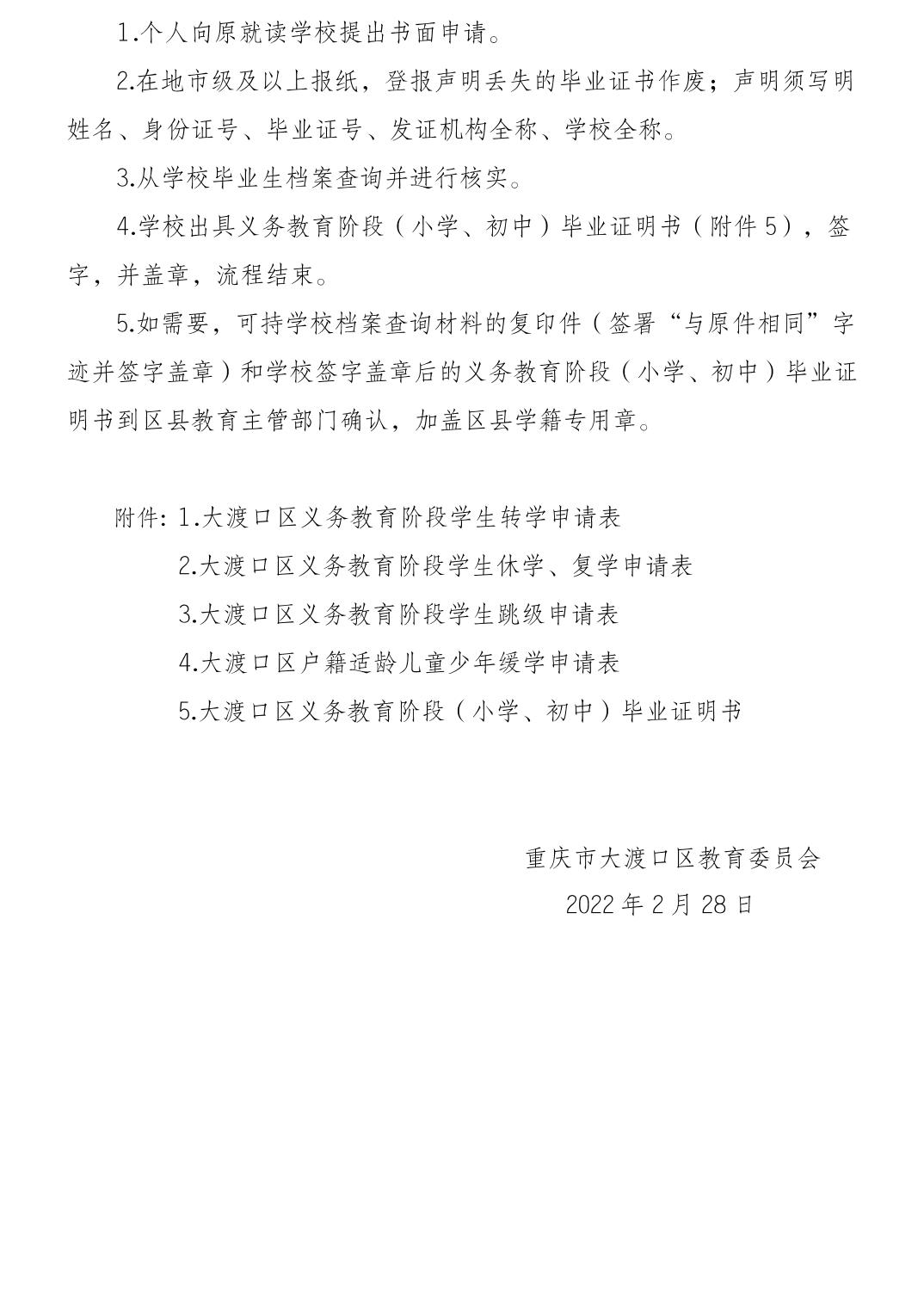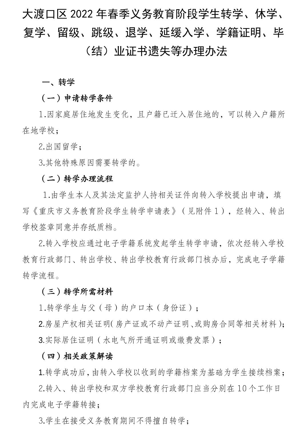 大渡口区2022年春季义务教育阶段学生转学、休学、复学、留级、跳级、退学、延缓入学、学籍证明、毕(结)业证书遗失等办理办法.pdf